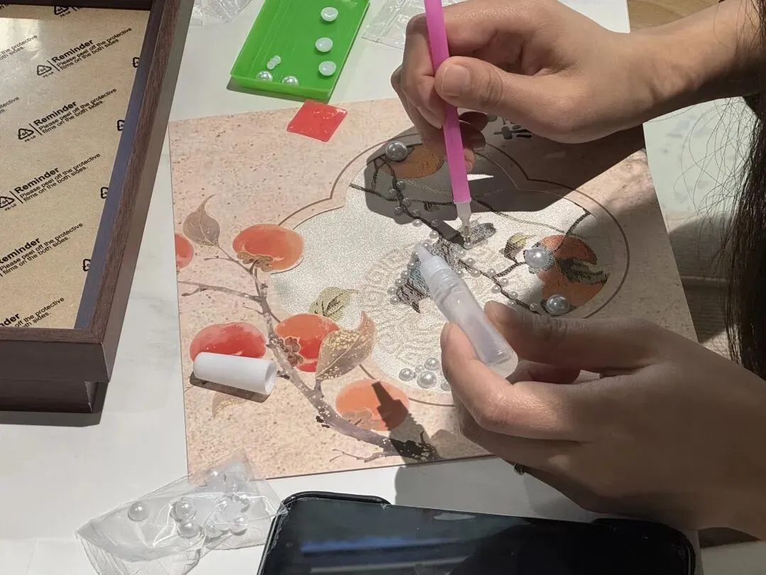 活动现场,参与的女神们将沉浸式解锁非遗之美:初识宋锦肌理、了解丝织匠心,学习珍珠搭配与构图技巧,亲手粘贴打磨,在慢时光中让传统技艺与现代审美温柔碰撞,消解日常忙碌疲惫,邂逅松弛与治愈。大家可自由搭配色彩排布,将春日诗意与女性柔美注入作品,亲手完成专属宋锦珍珠画。