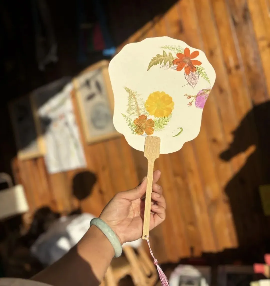采撷酒店周边的新鲜叶片与花瓣,通过最简单的敲拓染工艺,将植物的天然形态与柔和色彩永久定格在团扇之上。每一次敲击都是与自然的对话,每一把团扇都是独一无二的艺术品。