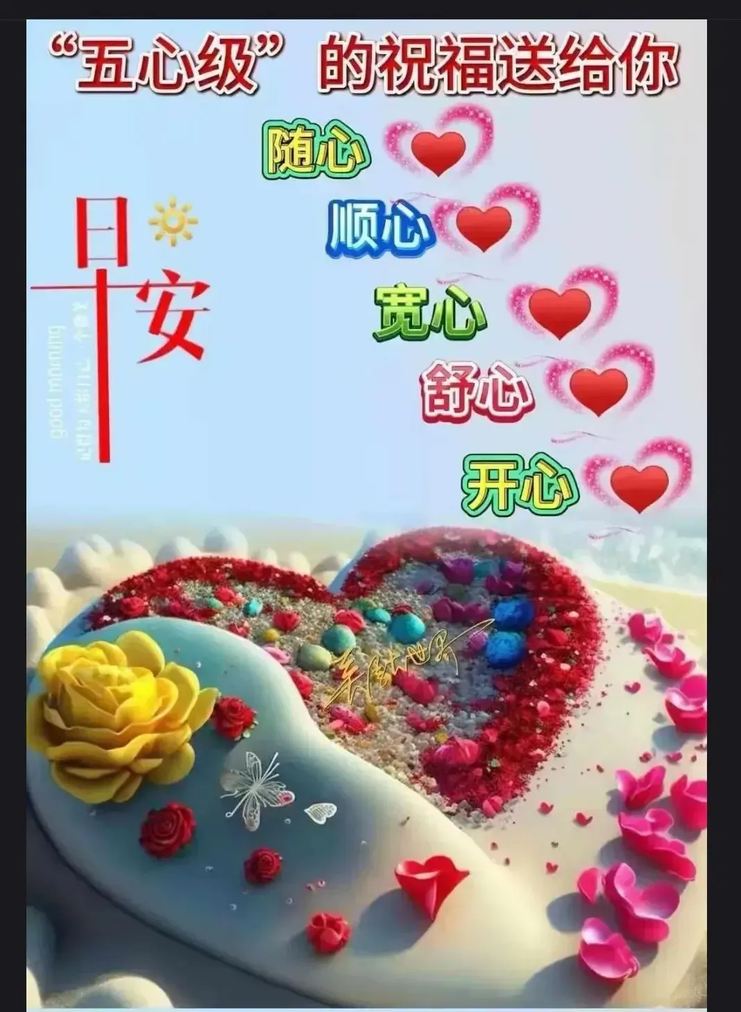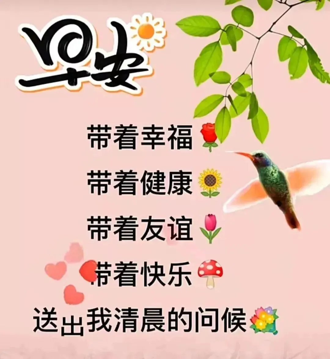 5,早上好!让温馨的问候萦绕在心间,让真挚的祝福伴随着你度过美好的一天。愿你的心情像清晨的阳光一样明朗,像清晨的空气一样清新,像清晨的鸟儿一样欢快。愿你每天都过得愉快,幸福!