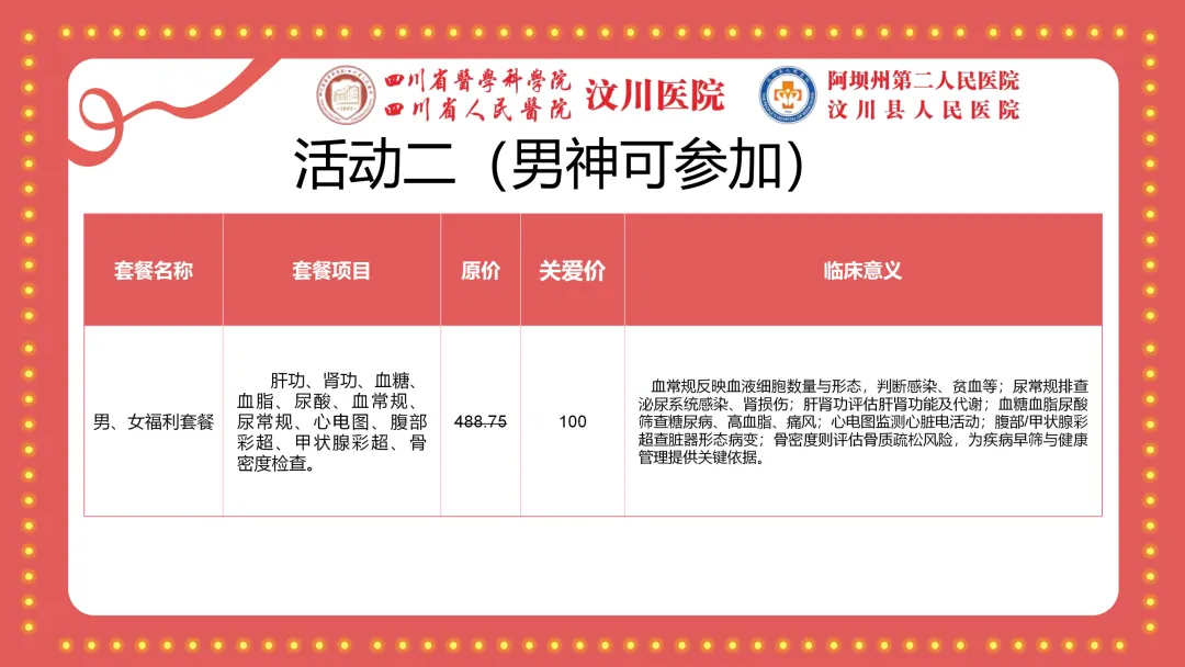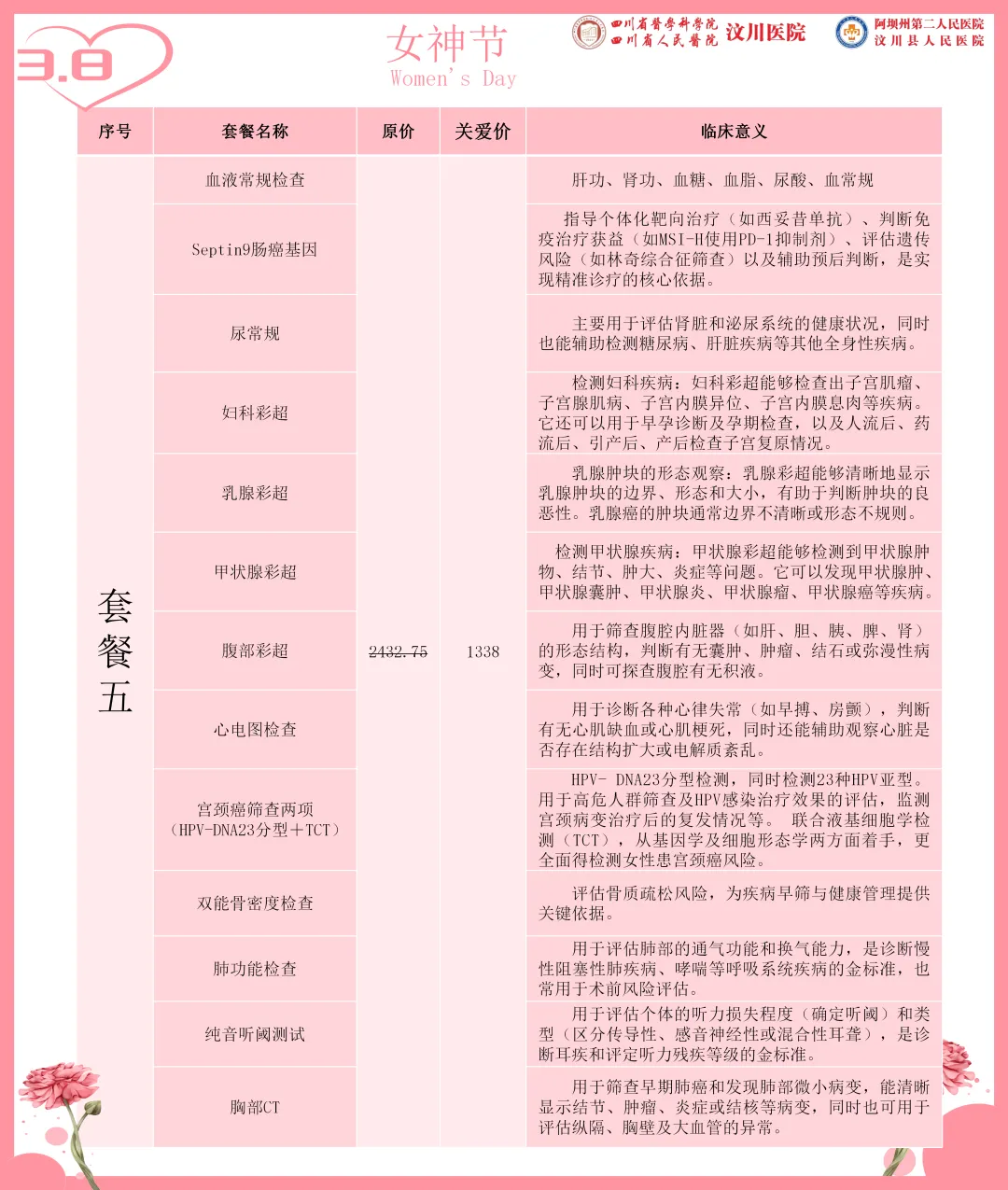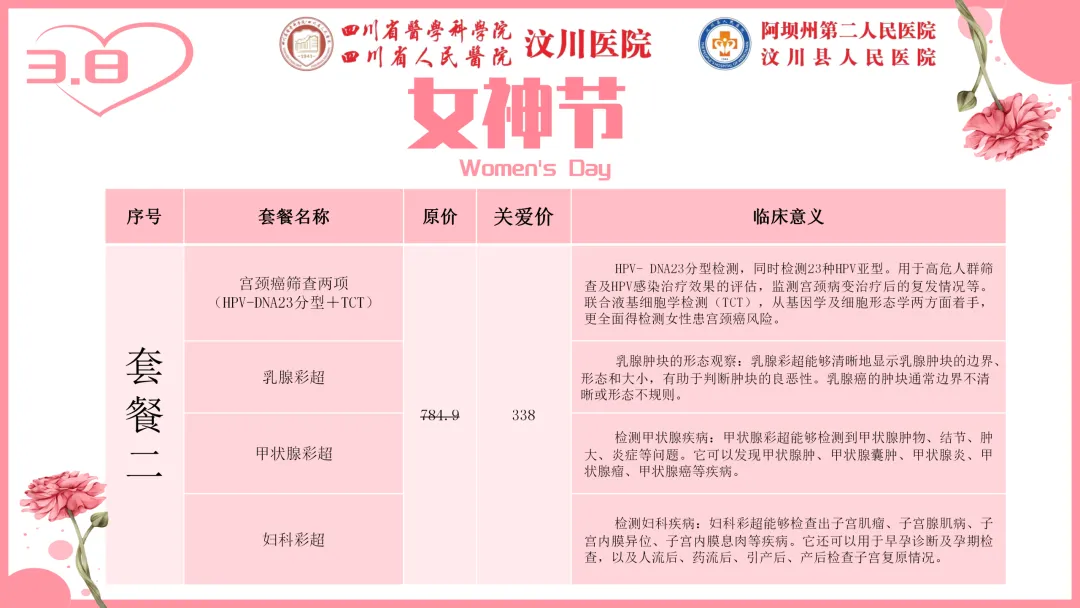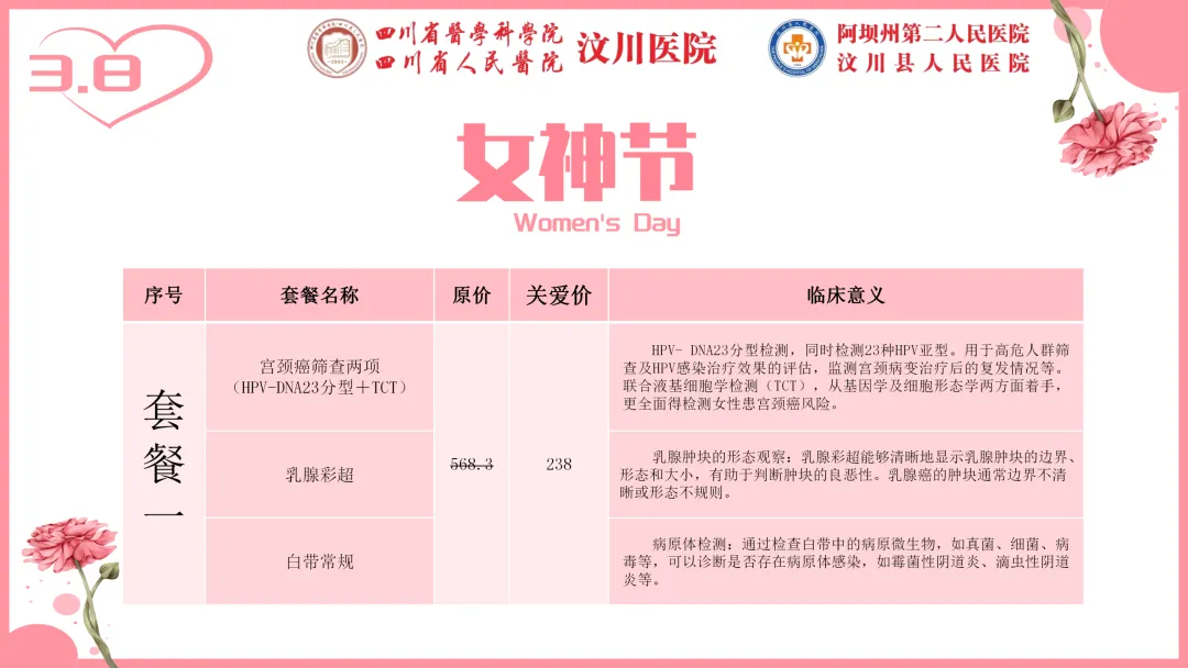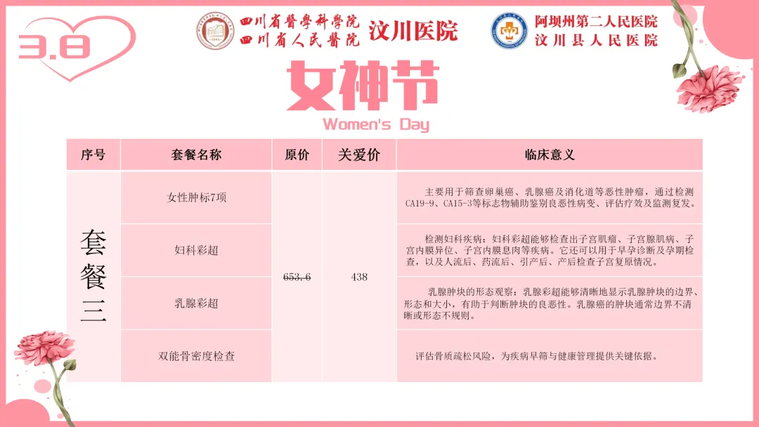 专属女神的节日里,汶川县人民医院(阿坝州第二人民医院)健康管理中心为您送上最贴心的健康礼遇。即日起推出“女神节专属体检套餐”,用专业呵护最美的您。