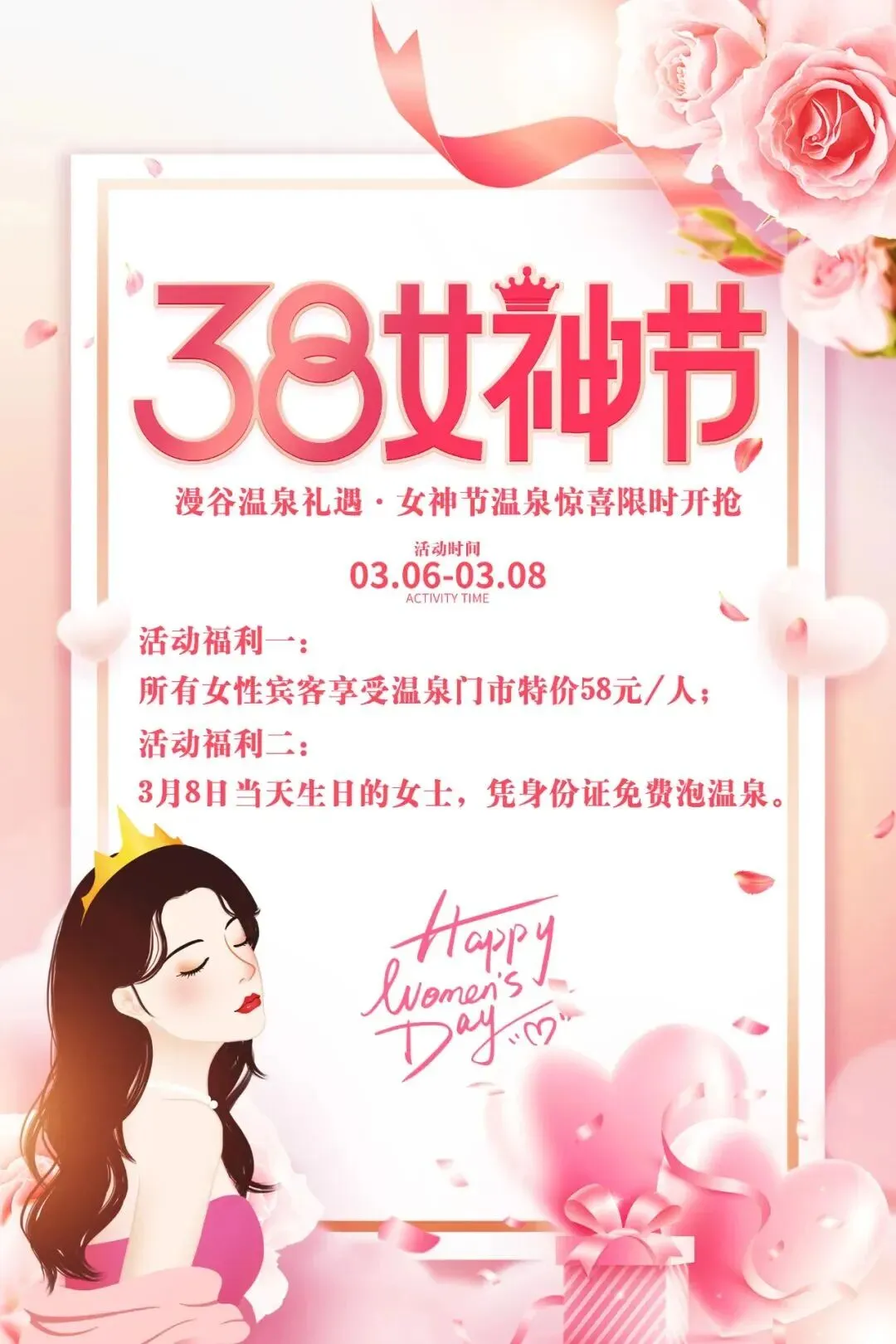 ①3月6日-3月8日所有女性宾客享受温泉门市特价58元/人。