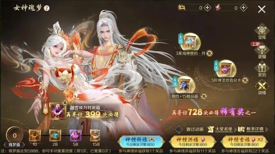 等级达到50级的神选者,可使用瑰梦宝图·188女神缘晶·1880参与“女神瑰梦”祈福活动。即有一定几率获得珍贵的融雪映月时装箱3星海神原初·符相性+15精品箱等精美好礼!