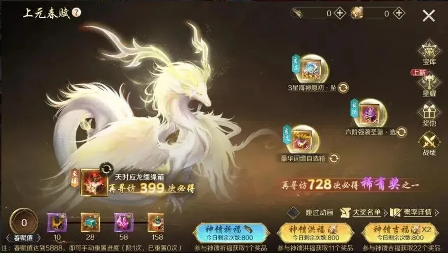 “上元春赋”活动将于3月12日23:59结束!还未获得天时应龙缰绳箱、3星海神原初·坠、豪华词缀自选箱、六阶强袭圣器·选等精美好礼的神选者,请抓紧时间使用祈春古卷·188颂春天书·1880参与活动,积累春赋值领取里程碑奖励!错过将不再有机会哦!