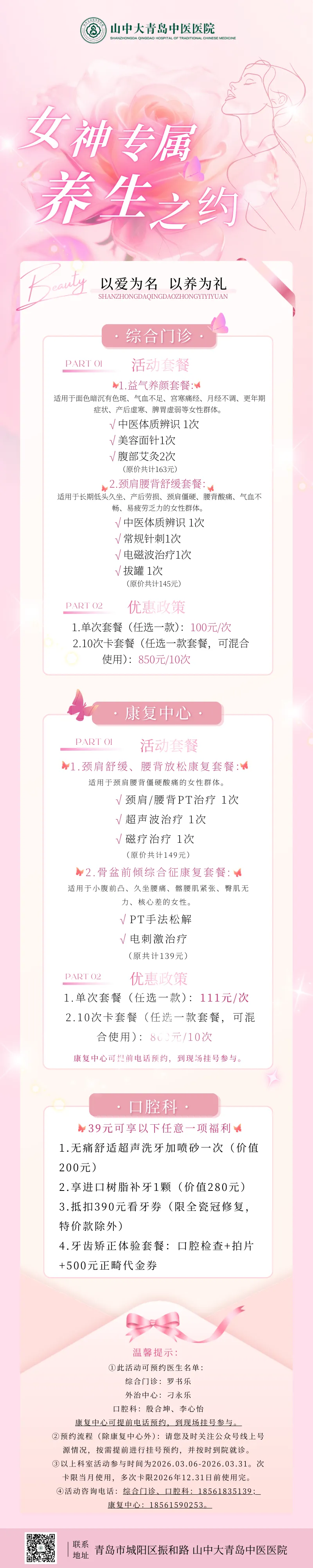 来山中大青岛中医医院,赴一场女神专属的养生养颜之约,解锁由内而外的健康与美丽。让每一条细纹都有故事,让每一寸肌肤都有光泽,让每一份身体不适都被温柔化解,愿每一位女神在岁月里好看、从容、健康!