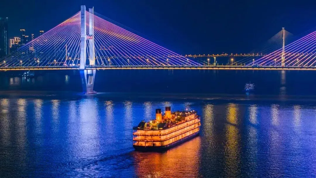 光影交织:游轮航行中,两岸灯光秀与氛围建筑灯光交相辉映,江风伴爵士老歌,浪漫直抵心底,不负每一份热爱与温柔