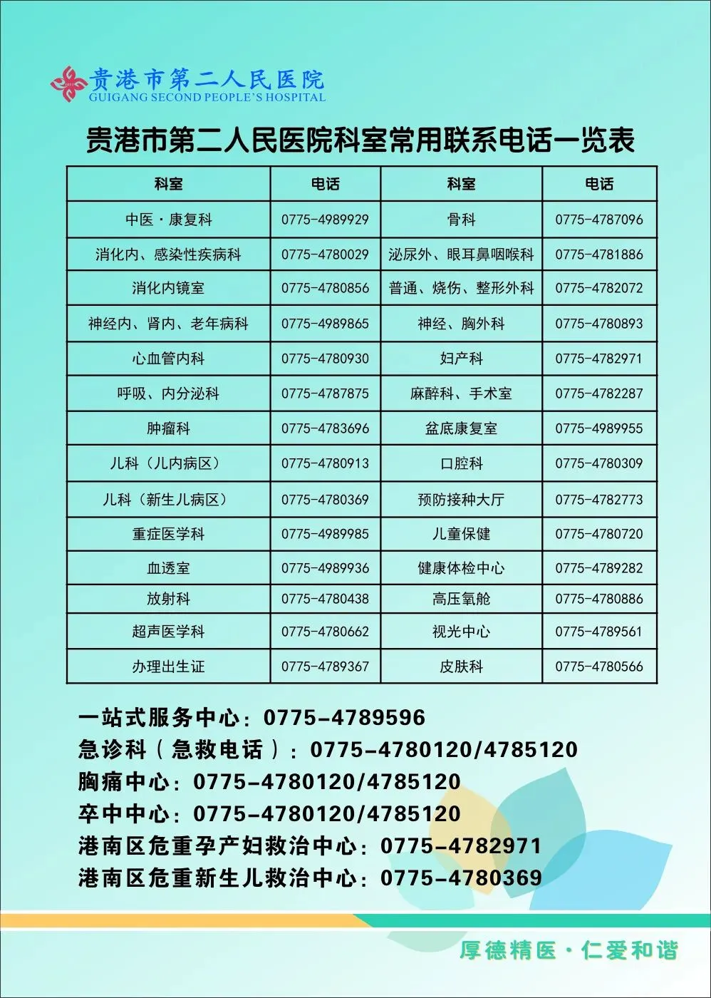 医院急救电话:0775-4785120/4780120