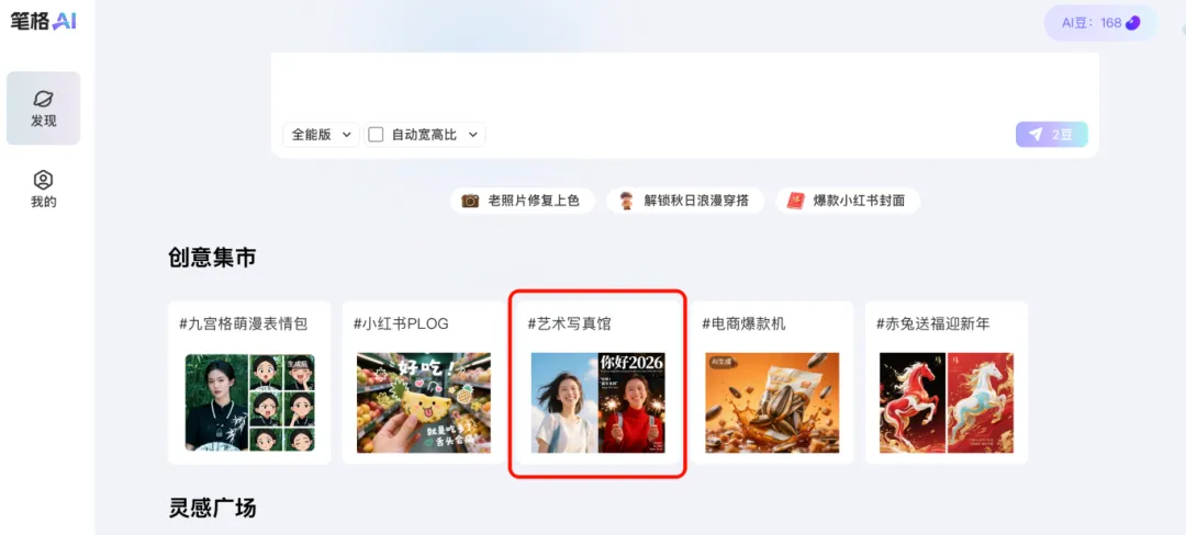不擅长写提示词的宝子,可以直接打开笔格AI,在首页找到艺术写真馆