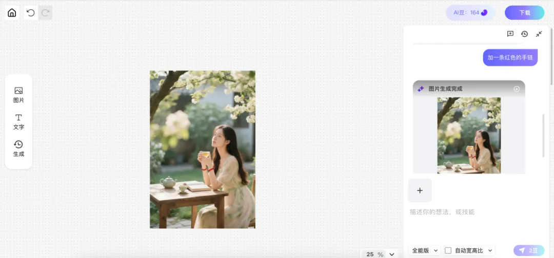 比如“加一条红色的手链”,AI就能一键完成改图。