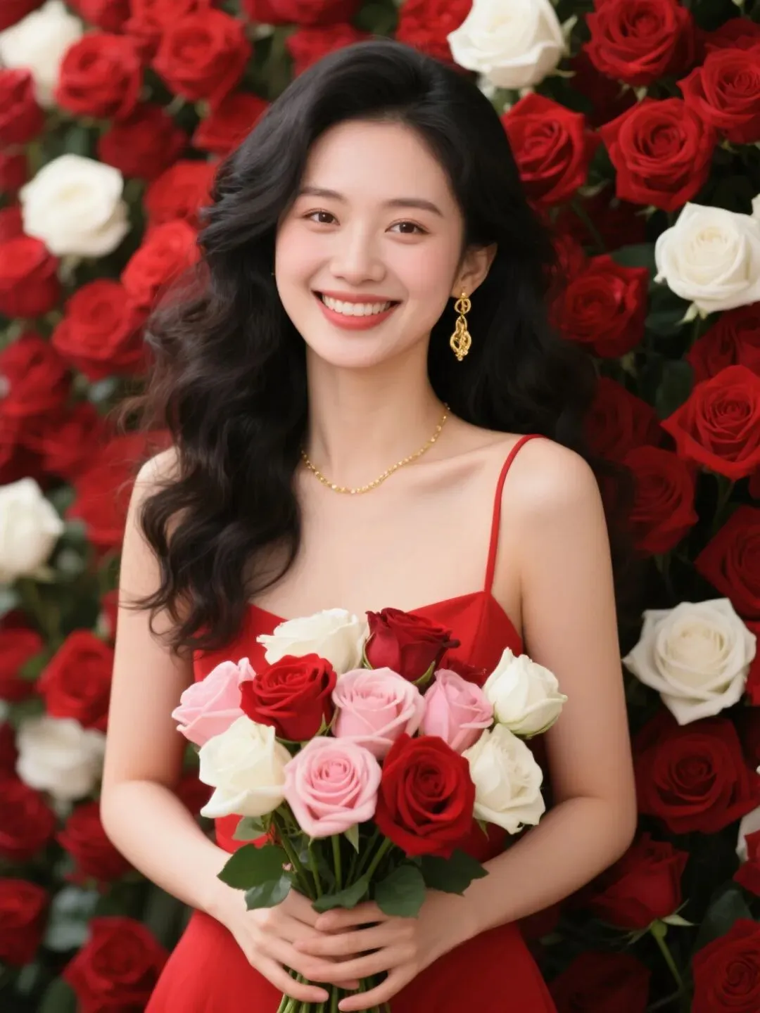 3/8 女神节写真,年轻东方女性,黑色大波浪卷发,温柔甜美的笑容,身穿红色吊带礼服,佩戴金色细项链和金色耳环,双手捧着一束由红玫瑰、粉玫瑰、白玫瑰组成的花束,背景是密集的红、白玫瑰花墙,暖色调,柔光打在面部,皮肤质感细腻,高清人像,8K,电影级质感,构图居中,氛围感拉满