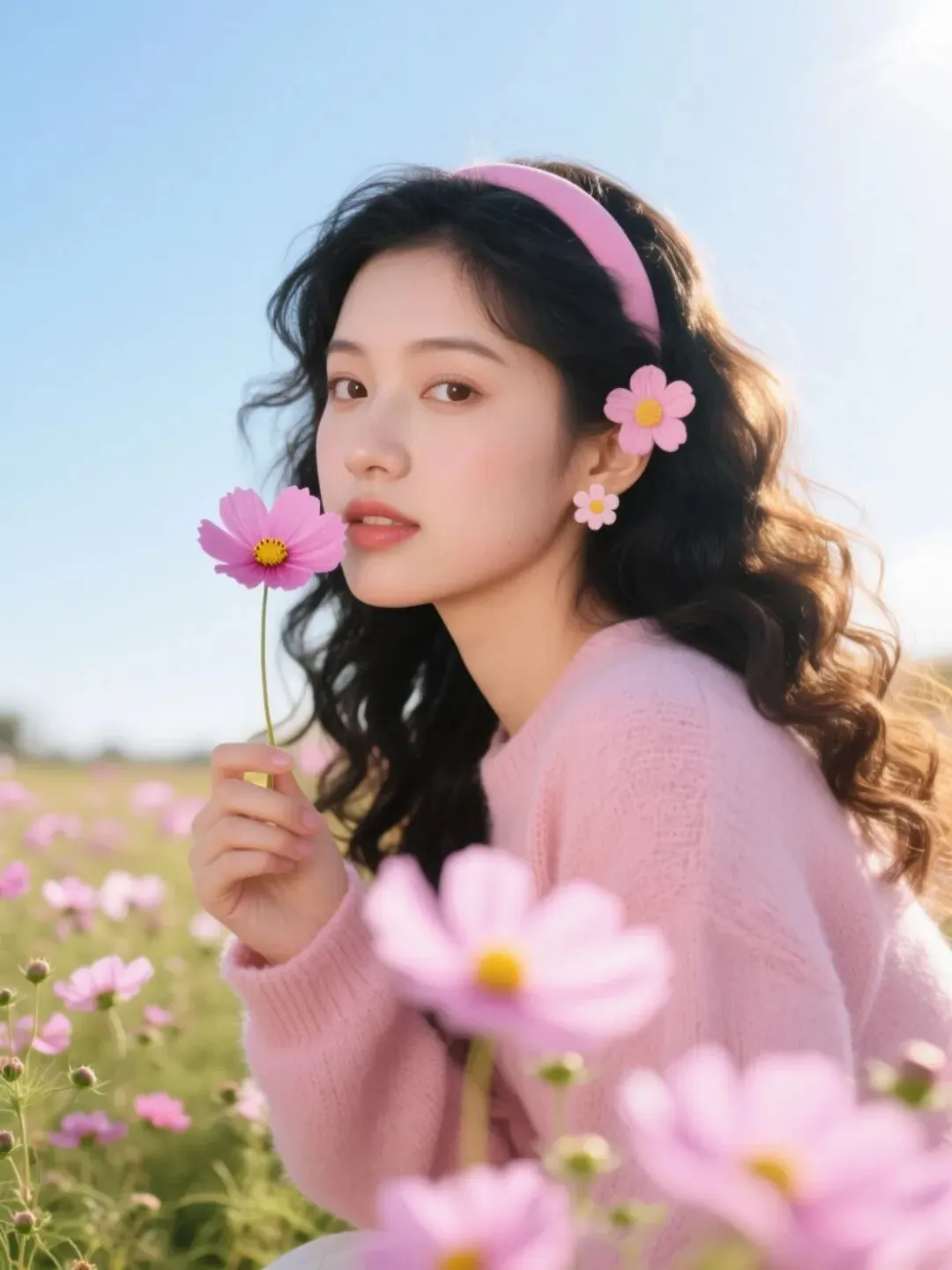 年轻东方女性,黑色大波浪卷发,佩戴粉色发箍和花朵造型耳饰,身穿粉色宽松毛衣,手持一朵粉色格桑花贴近脸颊,在开满格桑花的花田中,背景是晴朗的蓝天,阳光从侧后方洒下形成金色发丝光,浅景深,前景虚化的粉色花瓣,清新明亮的色调,胶片质感,高清人像,8K,构图自然松弛,氛围感拉满