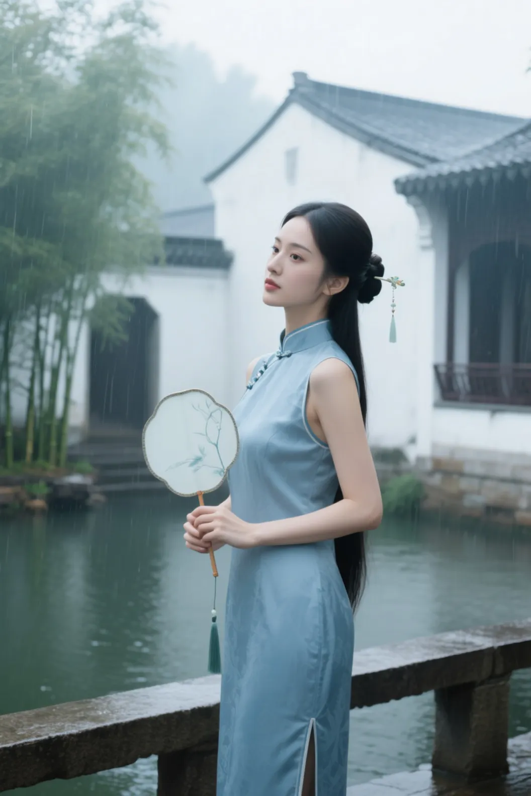 新中式女性写真,身穿淡蓝色旗袍,长发盘起插一支玉簪,手持团扇,站在江南庭院里,背景是白墙黛瓦、青竹绿水,烟雨朦胧氛围感,古风滤镜,色调雅致,人像温婉,高清 8K