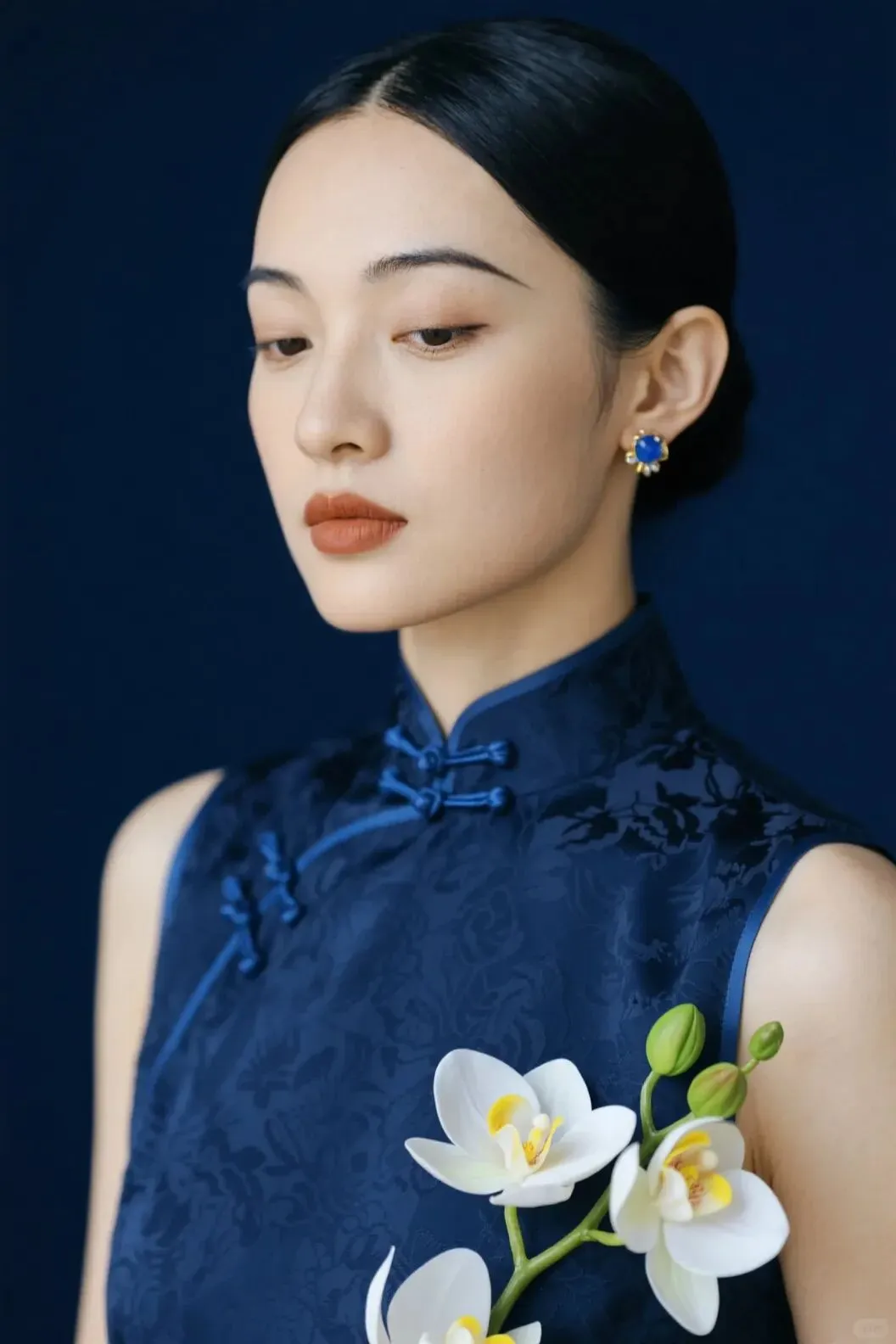 年轻东亚女性,黑发梳成服帖低发髻,身着深蓝色暗纹提花立领旗袍,搭配同色系蓝色盘扣;佩戴含蓝色装饰的精致耳钉,手持缀黄蕊、带绿花苞的白色蝴蝶兰。