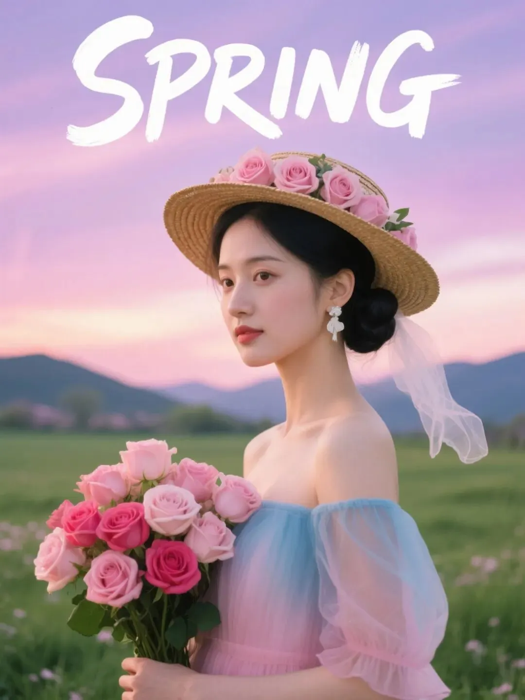 年轻东亚女性,黑色长发盘成低发髻,头戴装饰着粉玫瑰的大檐草编帽,佩戴白色纱质耳饰;身穿粉蓝渐变露肩薄纱连衣裙,手持一大束粉、玫红色玫瑰花束。