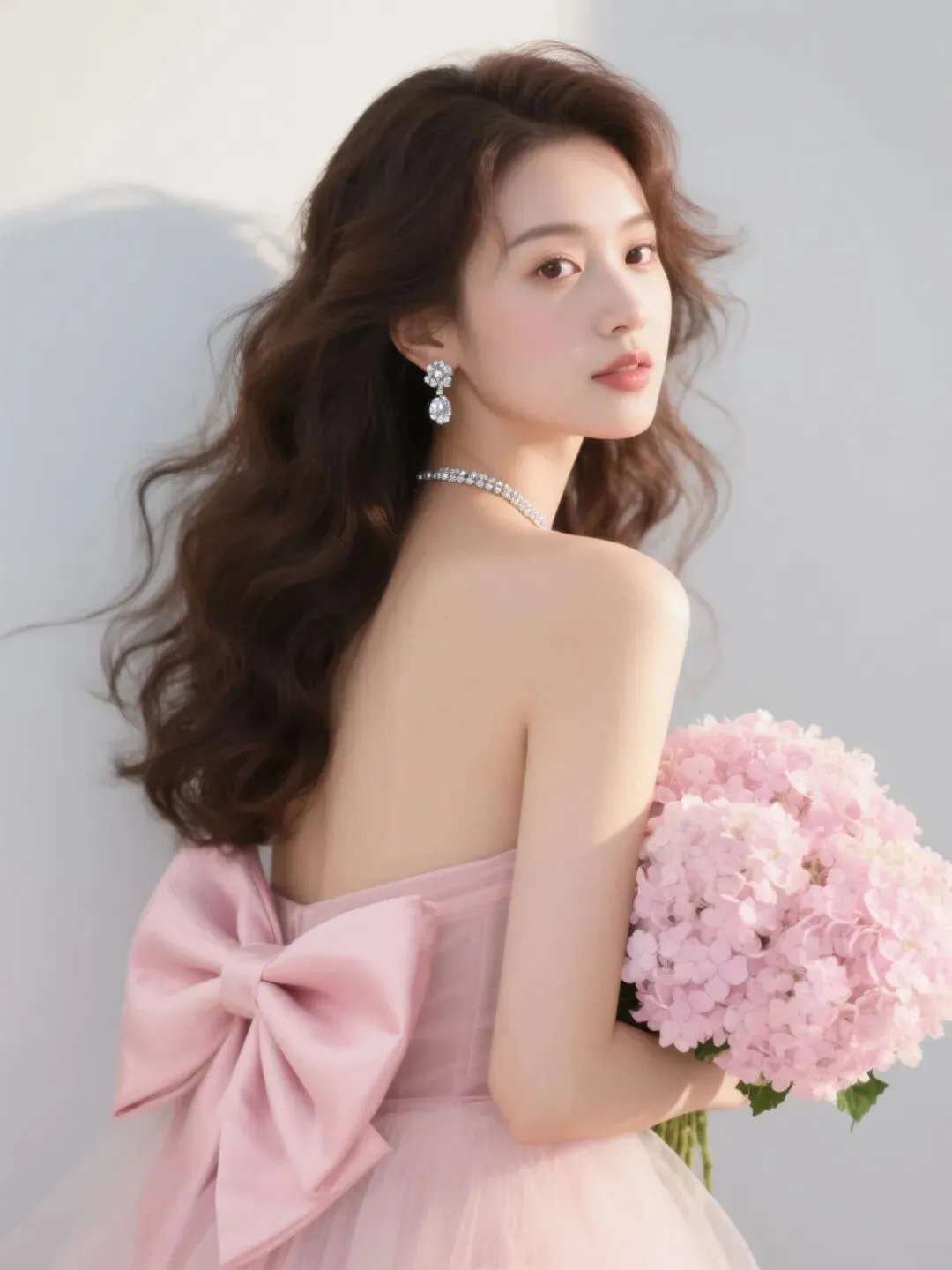 年轻东亚女性,深棕色大波浪卷发被微风吹拂,发丝轻扫脸颊;佩戴华丽的钻石耳饰与钻石项链,身着粉色抹胸纱裙,背后有一个巨大的粉色缎面蝴蝶结装饰,手持一大束粉色绣球花。