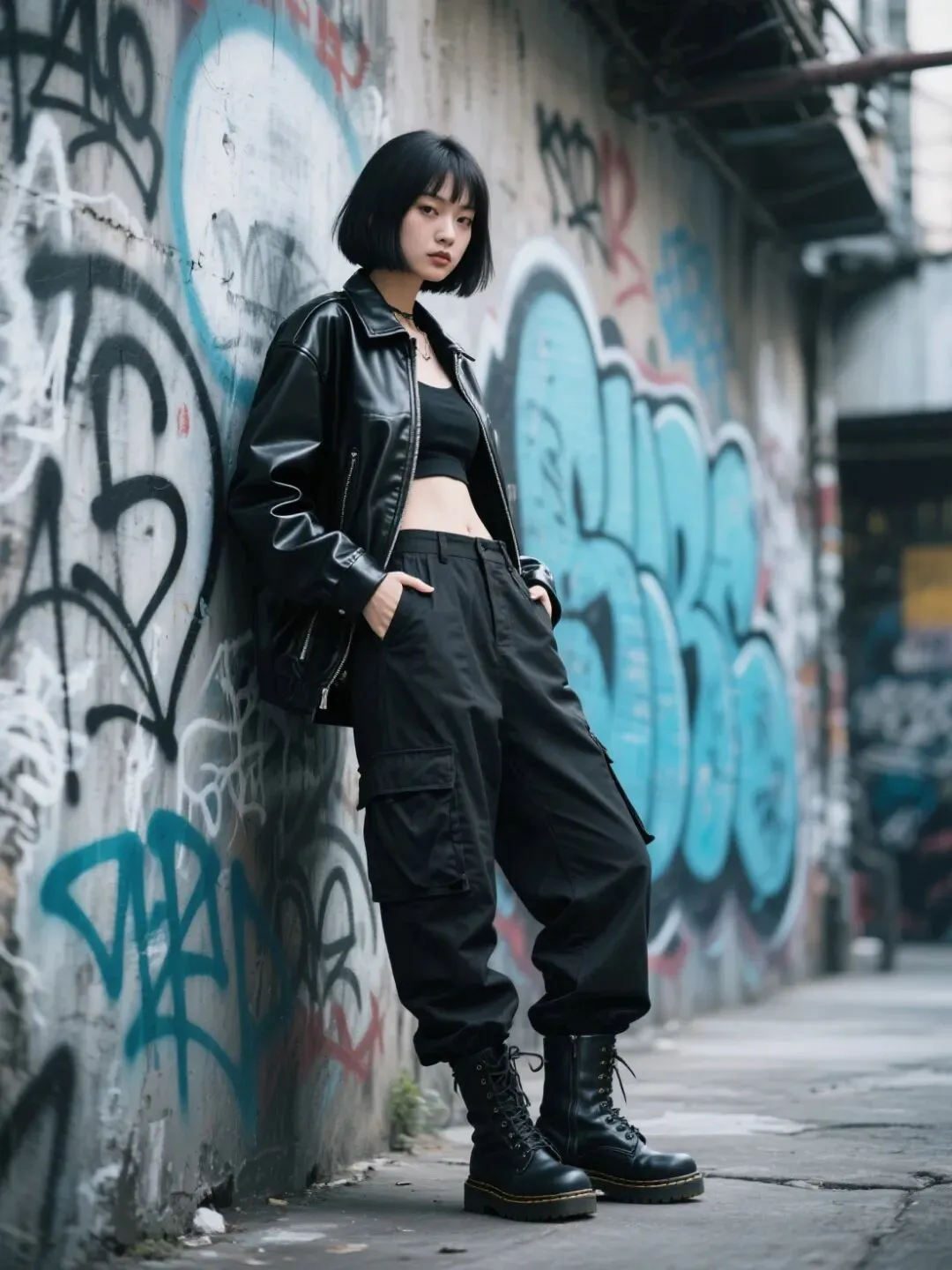 酷女孩街头写真,短发造型,身穿黑色皮衣搭配工装裤,脚踩马丁靴,靠在涂鸦墙前,双手插兜,眼神酷拽,街头潮流风格,冷色调,高对比度,细节锐利,高清 8K