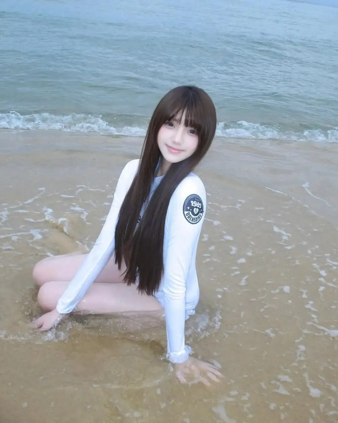 动作要领蹲坐在沙滩浅水区,双膝并拢,双手抱膝或轻放在腿上,身体稍稍前倾,长发披散遮住部分脸颊。抬头看向镜头,眼神温柔含笑,唇角自然上扬。海浪轻轻涌过腿部,水花溅起小小浪花,白色的泳装在湿润沙滩映衬下更显纯净。这样的蹲姿可爱又亲切,拍出来既有少女的俏皮感,又带点安静内敛的温柔,非常适合作为海边写真收尾照。