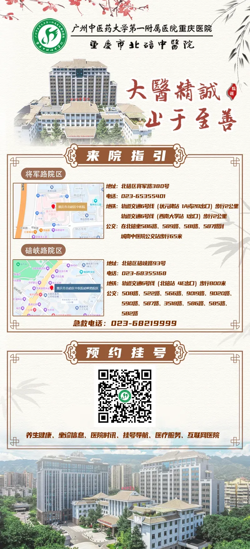 2.广州中医药大学第一附属医院重庆医院(重庆市北碚区中医院将军路院区)二楼妇科门诊 238 室:星期一至星期五全天(仅开展宫颈癌、乳腺癌、白带免费筛查项目)。