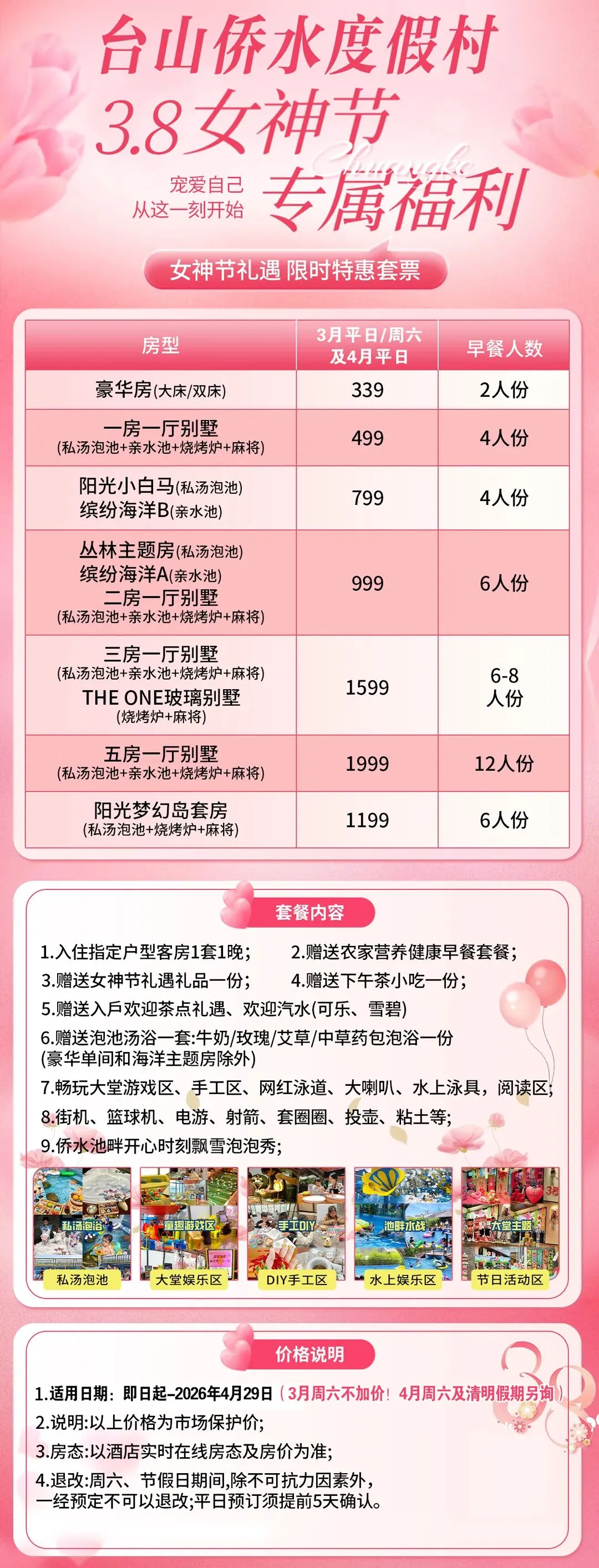 【38女神节送福利*周六不加价】台山侨水度假村~豪华房339元!早餐+节礼品+网红泳道+欢迎茶点饮料+畅玩大堂游戏区+泡泡烟花秀+亲子DIY