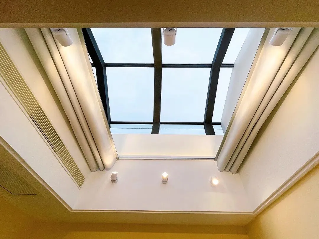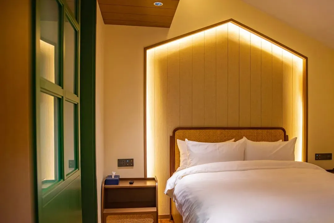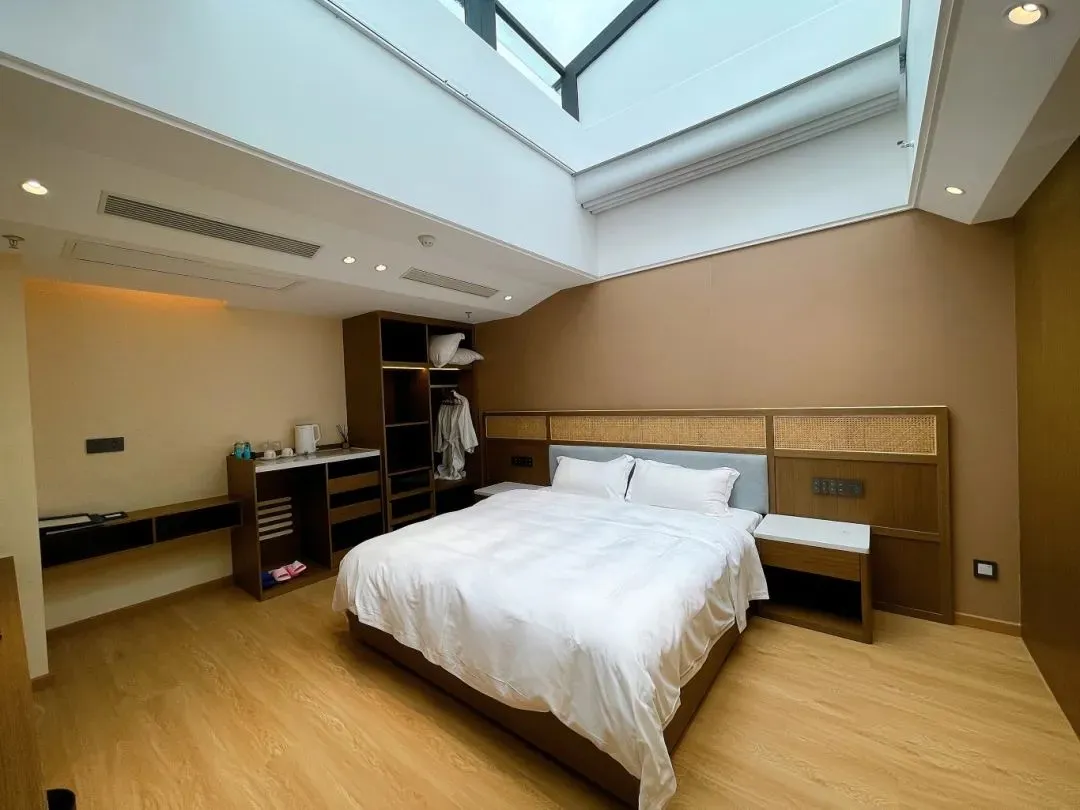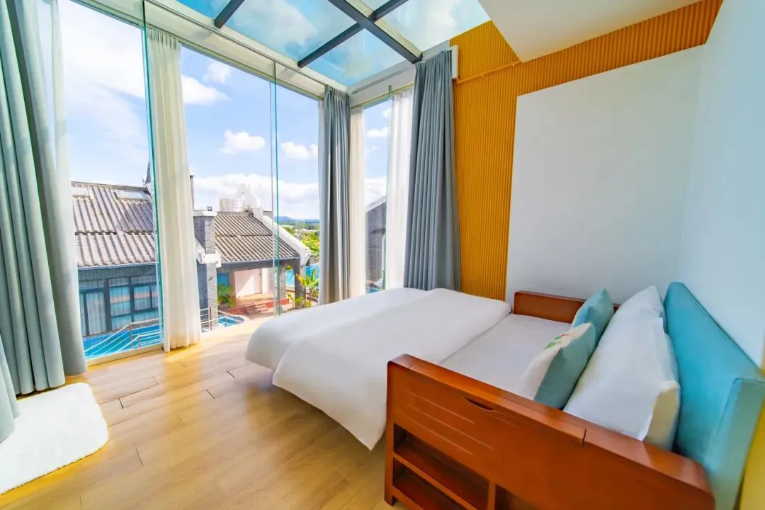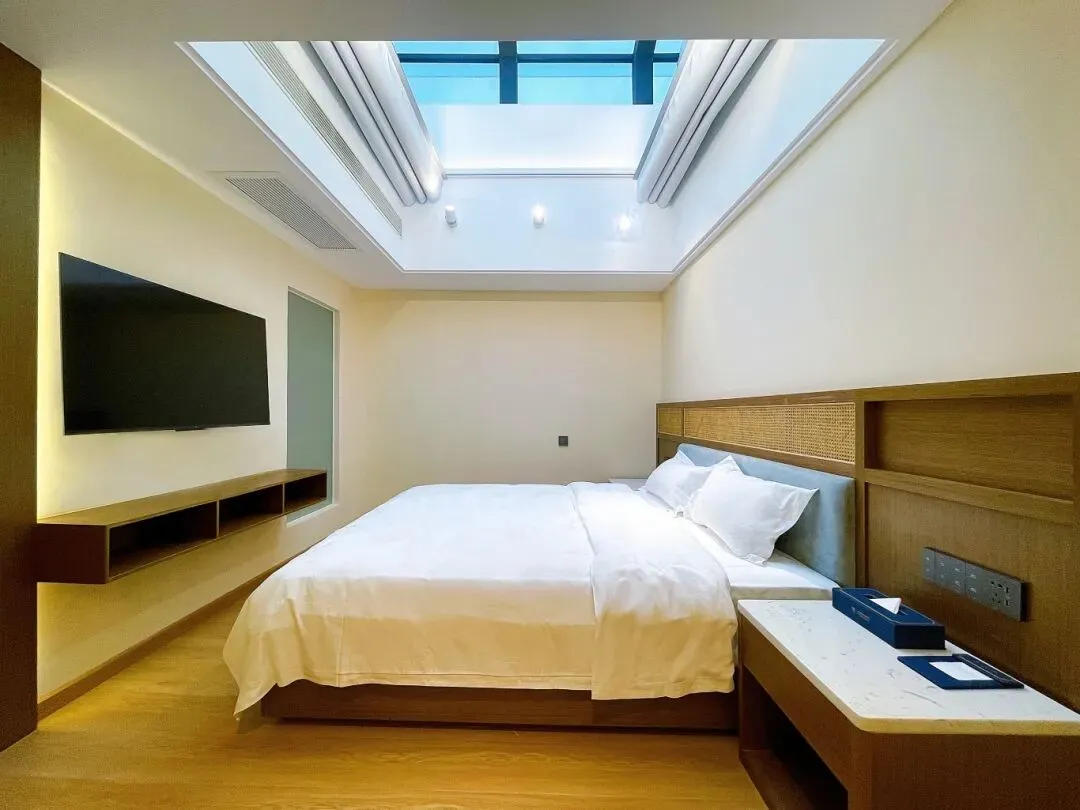 豪华星空房,房间顶部装设天幕玻璃,白天能更好的采光,夜晚更能让客人伴星入眠,颇为惬意。