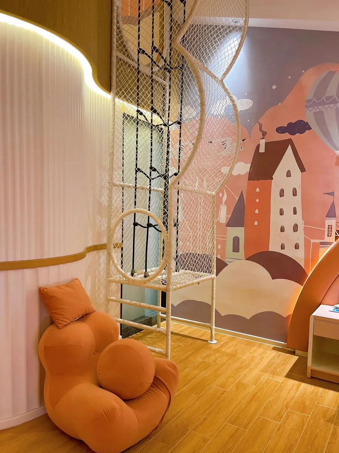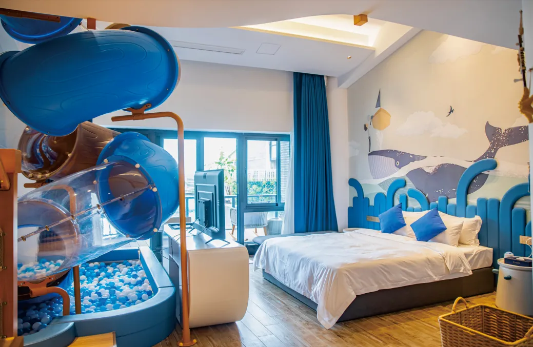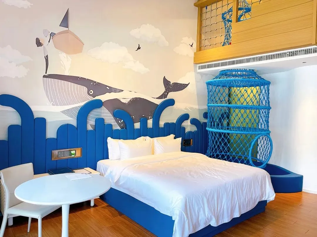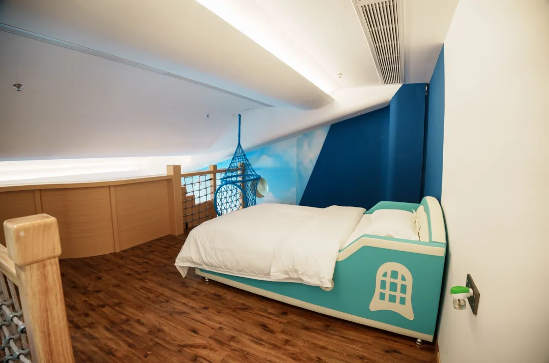海洋主题房,利用了高挑的楼高空间设计成复式户型。在蓝色大海的深处,除了鲸鱼和珊瑚,还有“溜娃三宝”滑梯、爬网和波波池,就算待在房间里也能high玩一整天!