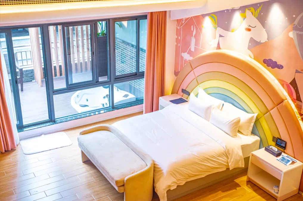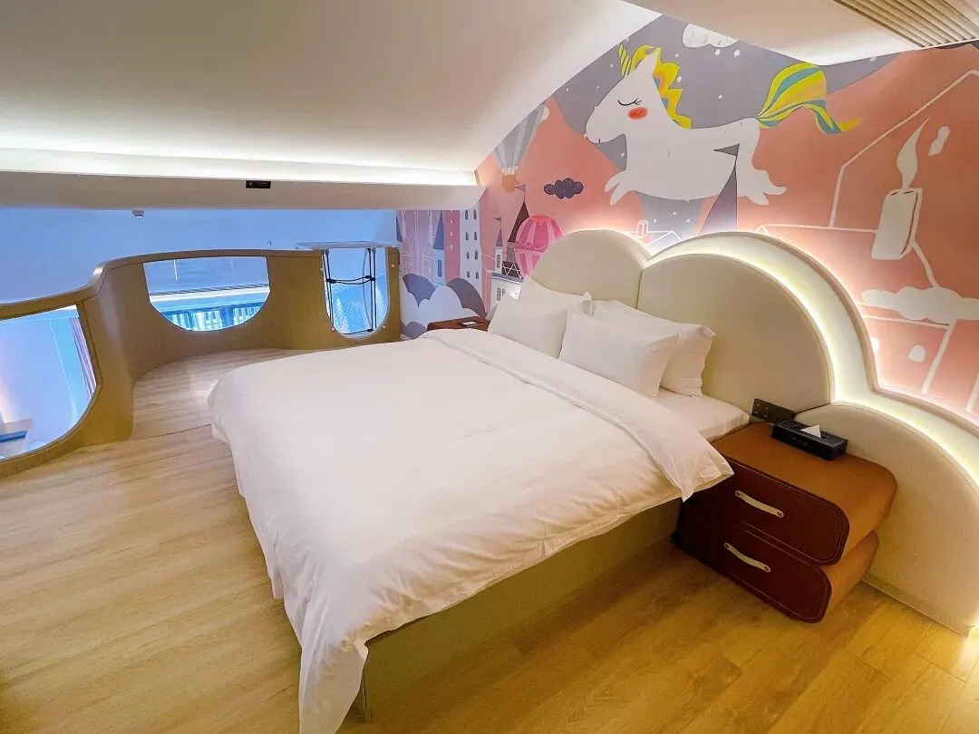 小白马主题房,充满梦幻色彩的房内设计,带着童话色彩的复式亲子房,满足每一个小朋友成为王子公主的梦想。不仅有可以直接爬到第二层的攀爬网,露台还自带按摩泡池。