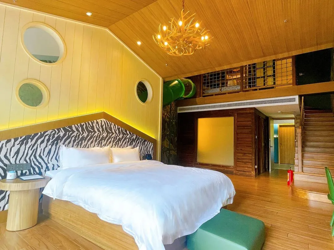 丛林主题房,充满绿意的大型亲子房,内置大小朋友都能玩的欢乐滑梯,露台自带按摩泡池,让你仿佛置身大自然中入睡。各位小小探险家们,你们能找到调皮的小猴子躲到哪去了吗?