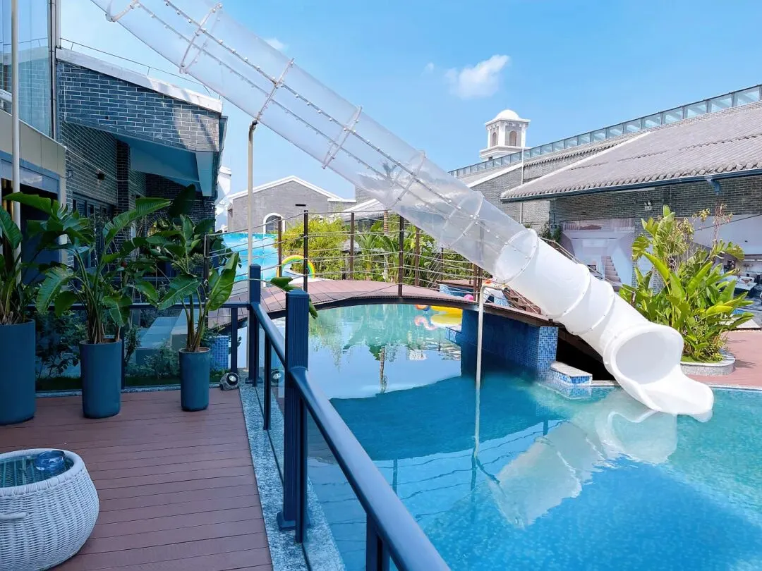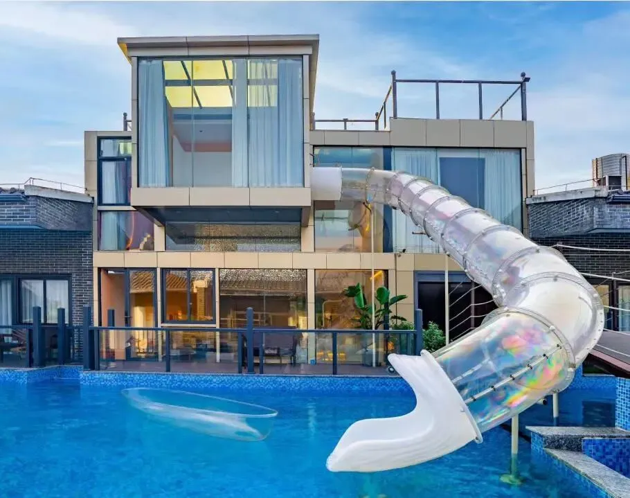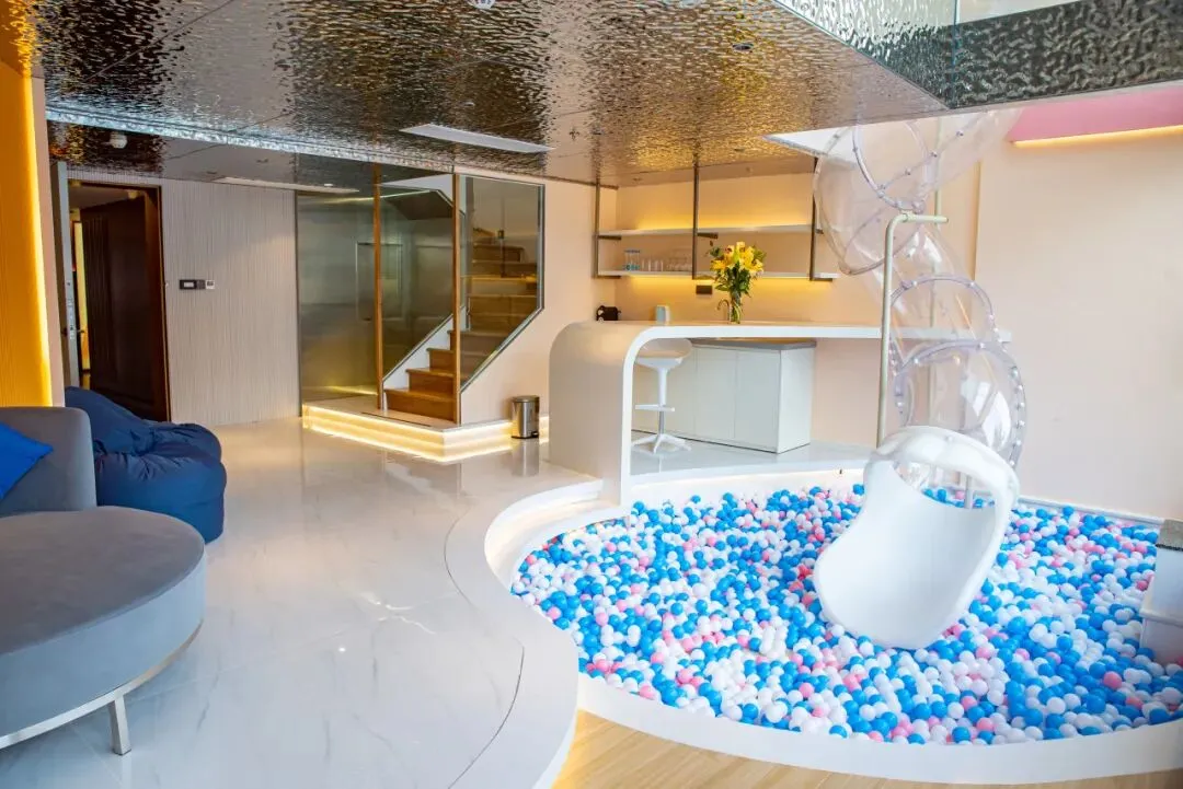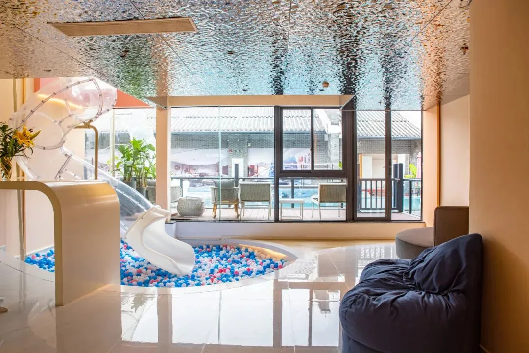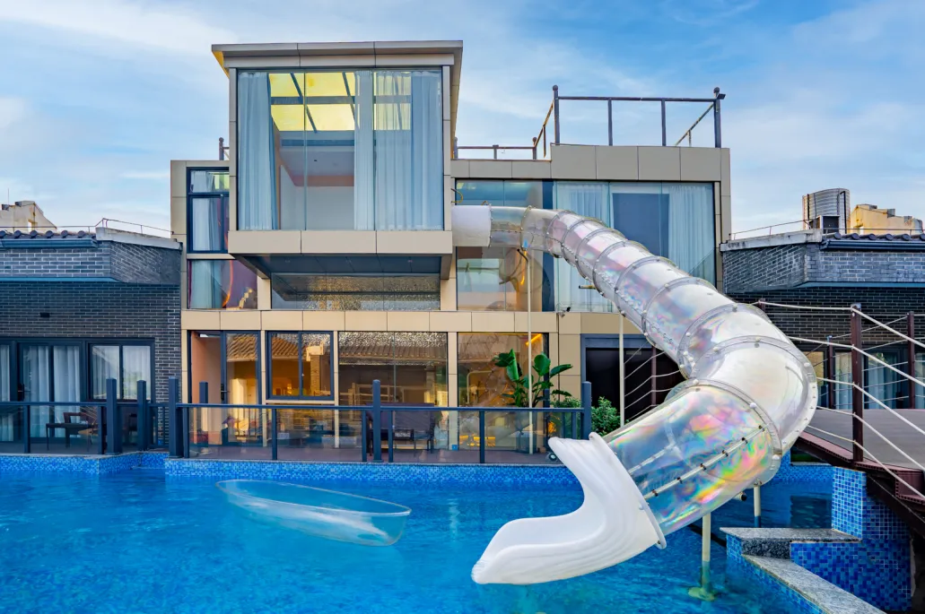 THE ONE玻璃别墅,超大独立天台,能直接看到大半个酒店的美景,仲夏的夜晚和三五知己一起吹着晚风烧烤,享受属于夏天的仪式感。你可以从房间里的滑梯滑进一楼的超大波波池,也可以坐着直通泳池的超长滑梯一头扎进清凉的泳池中。