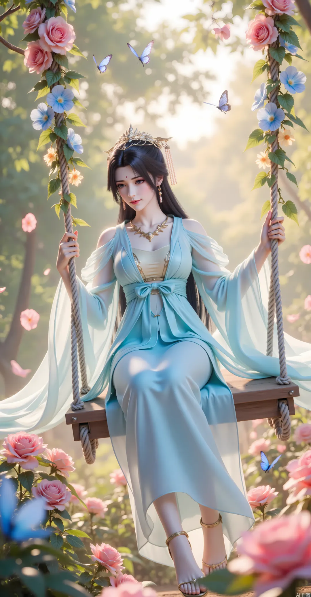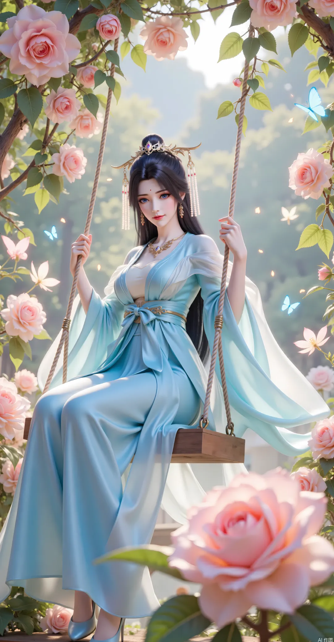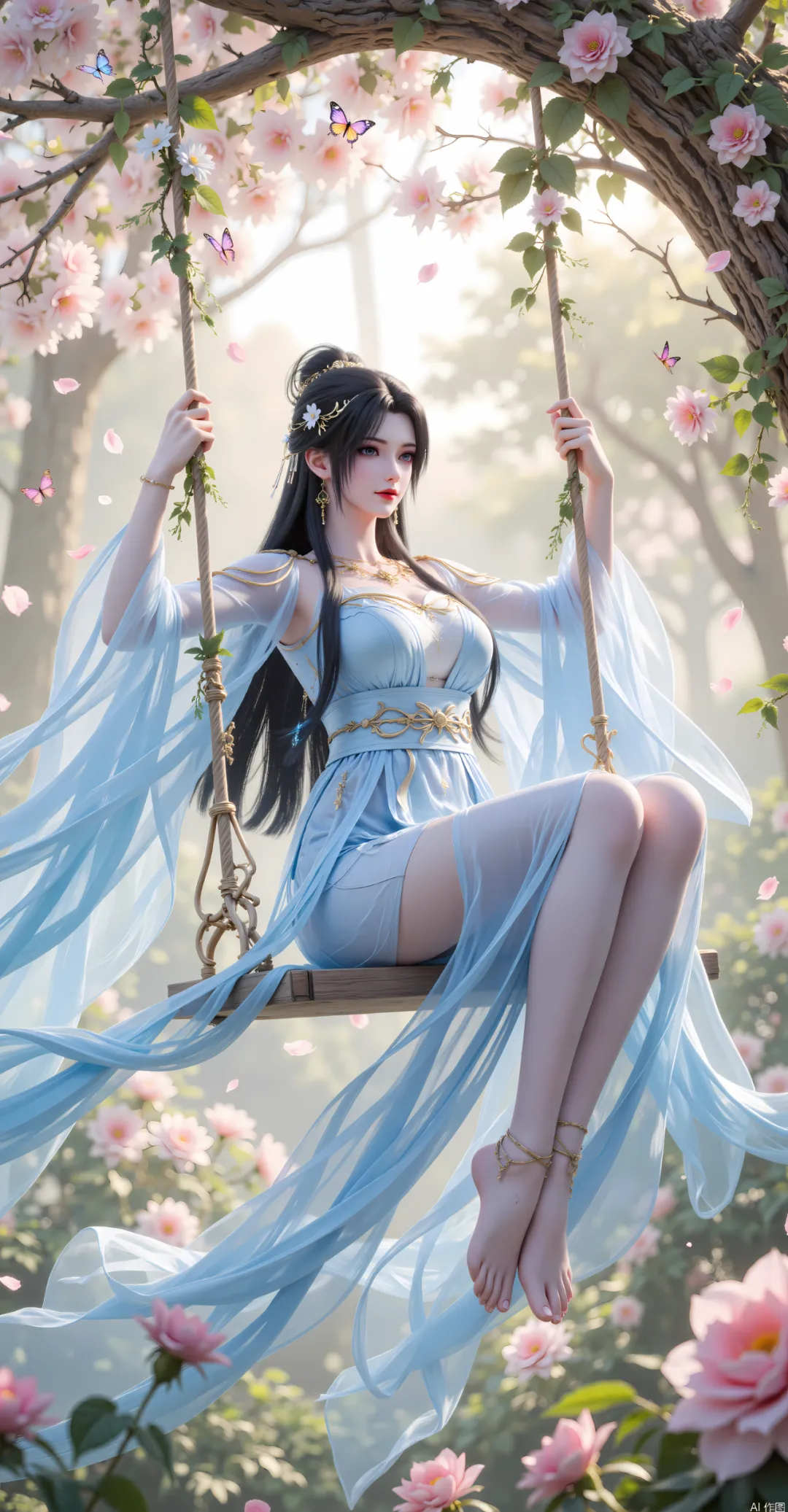 她的发丝是乌黑柔顺的,长度及腰,通常用一根简单的玉簪松松束起,余下的发丝自然垂落,发尾微微卷曲,被风吹动时,如月华流转,添了几分随性与空灵[3]。偶尔会将头发披散,用一层薄薄的白纱轻轻束在发间,既贴合她的仙子气质,又暗合补天教的道装风格[3]。此时的她,身形纤细而不柔弱,肩背挺直,带着修习道法的挺拔感,行走时步履轻盈,如踏月而行,透着清灵飘逸的仙气,既有少女的青涩懵懂,又有修士的沉稳内敛,完美诠释了“初出茅庐的圣女次身”的模样[2][3]。