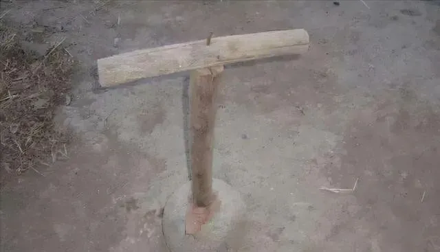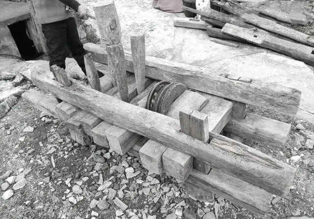 一个大木头架子 , 中间掏空放菜籽饼 , 往里头塞木楔子 , 拿大锤一下一下砸进去 , 空间越来越小 , 油就慢慢从底下淌出来了。