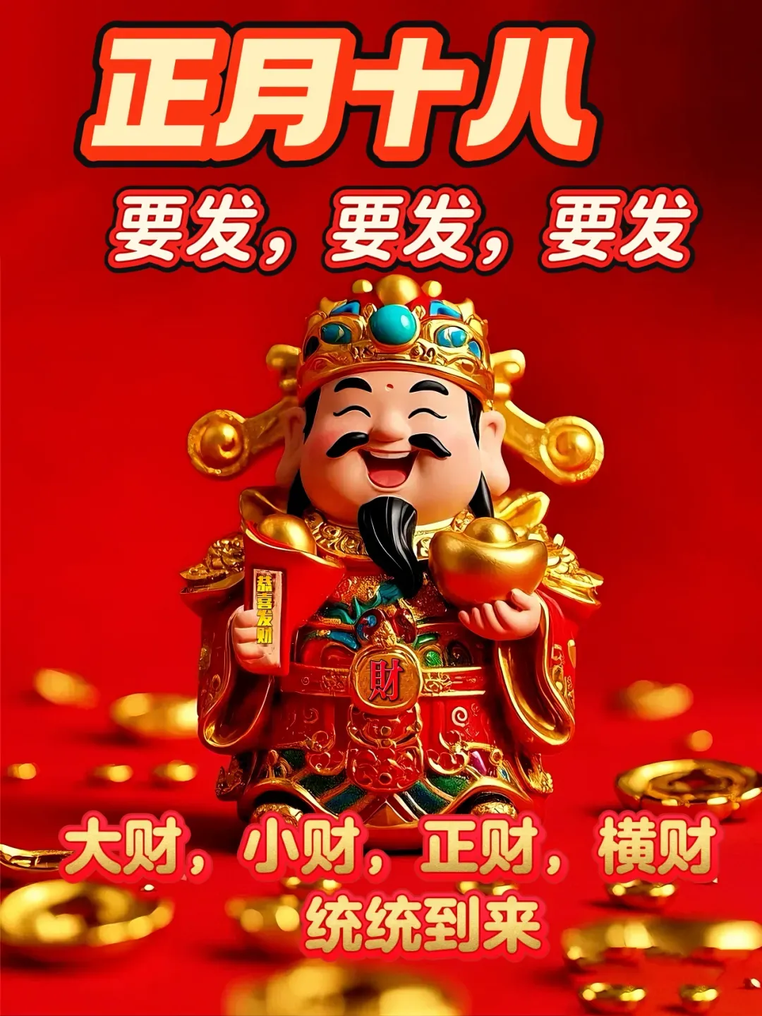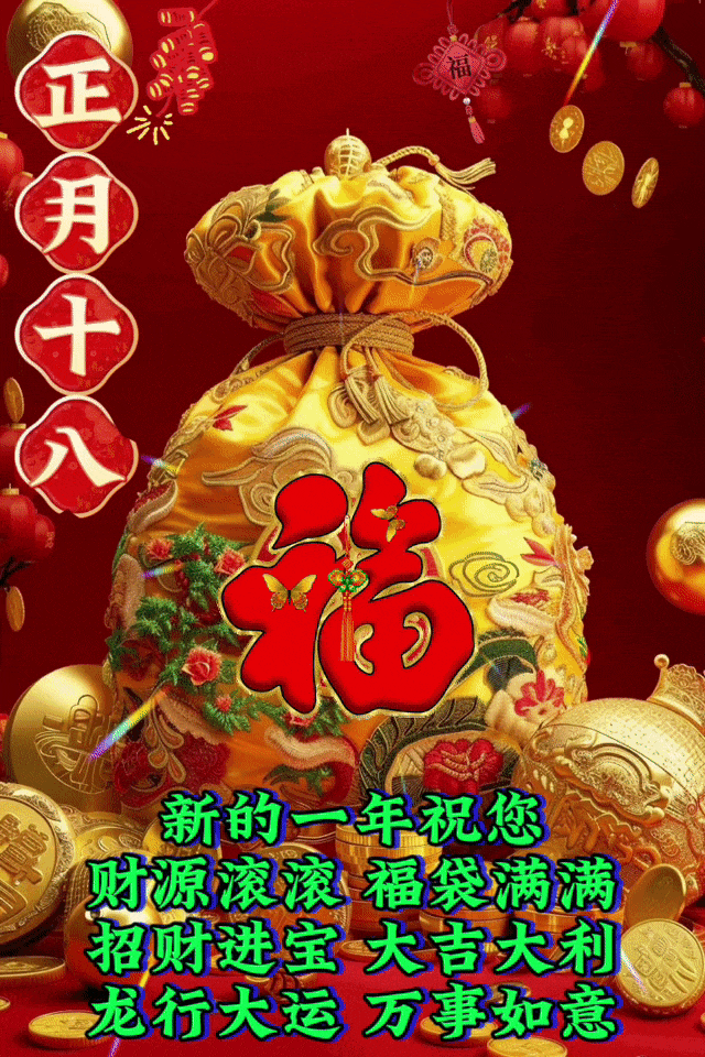 正月十八发财日,恭喜发财发发发,祝你在新的一年里,事业发,爱情发,财运发,早也发,晚也发,一定发,鸿运当头,发发发,大富大贵,发发发!