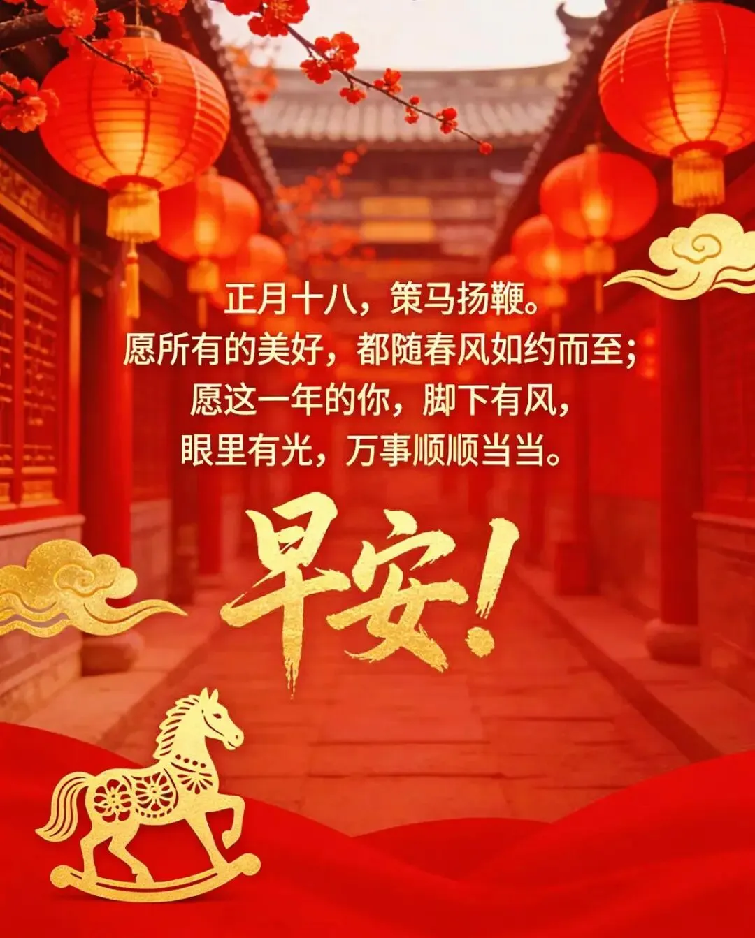 早上好!一心一意的祝福,藏进一串串温暖的文字,在今天这个祝福的日子里,将最真心的祝福送给你,祝你一家和和睦睦,一年开开心心,一生快快乐乐,一世平平安安。正月十八安康吉祥,马年幸福美满!