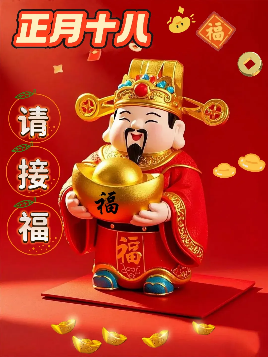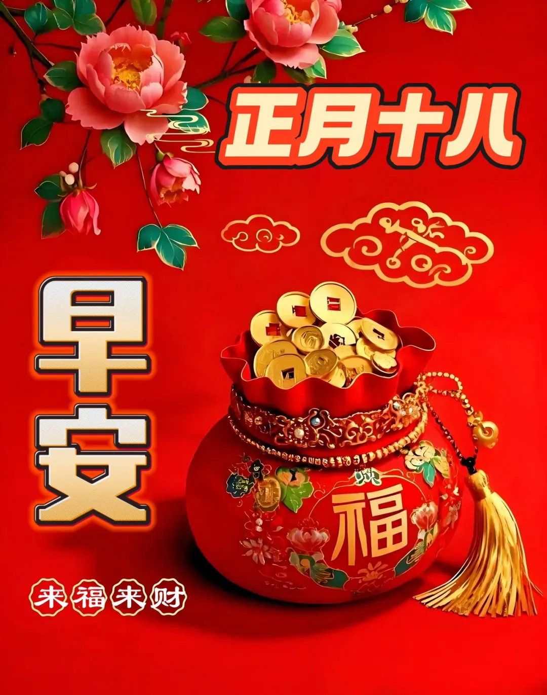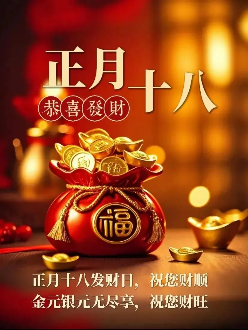 正月十八发财日,恭喜发财发发发,一个财神跟着你,一路平安围绕你,一声问候祝福你,一生顺利围绕你,一生健康陪伴你,一世好运追随你,一生一世祝福你,一辈子幸福拥抱你!