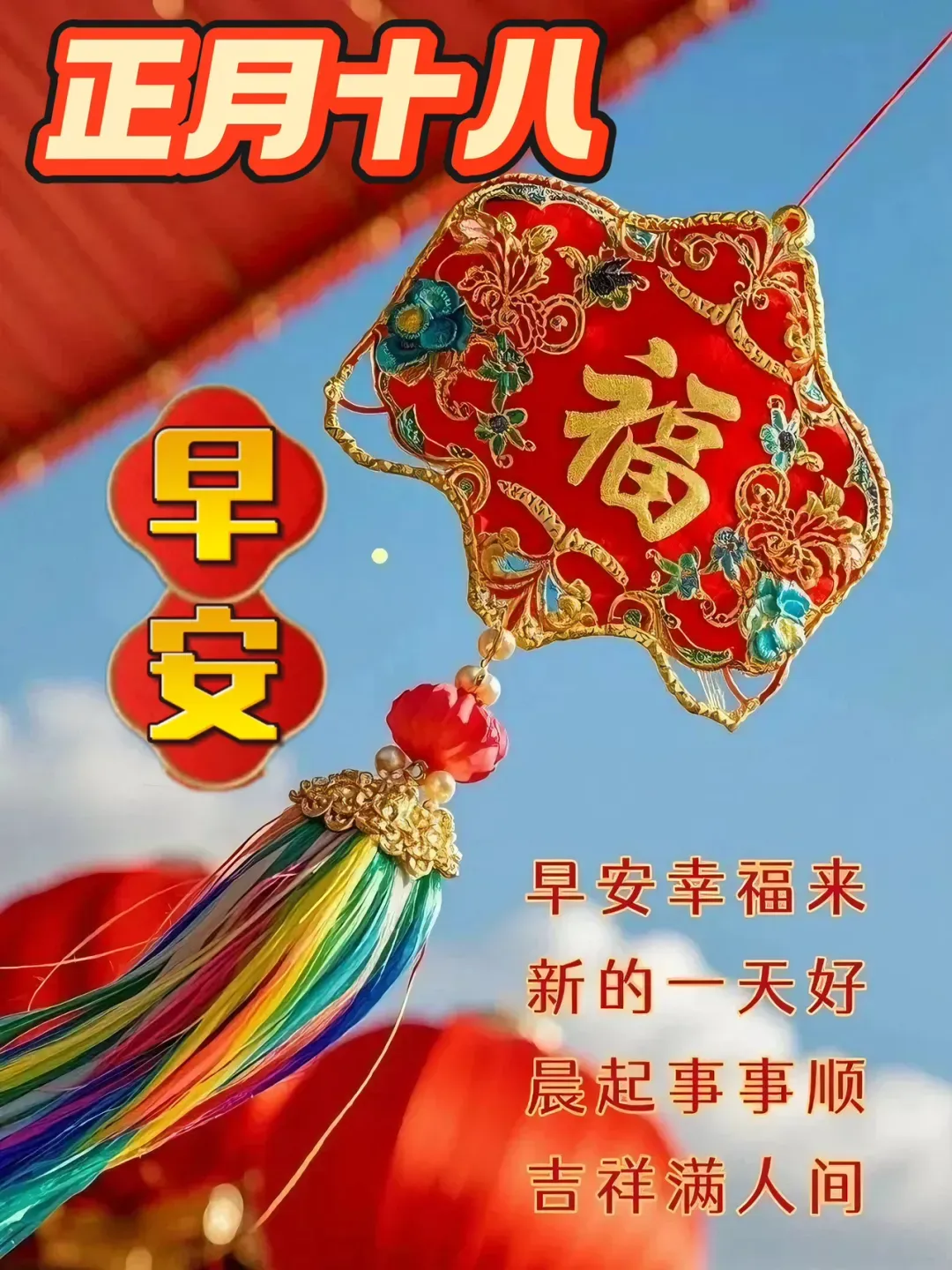 早上好,正月十八,龙腾虎跃迎新春。愿你事业如日中天,财源滚滚来;家庭和睦美满,幸福常相伴。祝你在新的一年里,八方来财,步步高升,万事如意!早安!朋友。