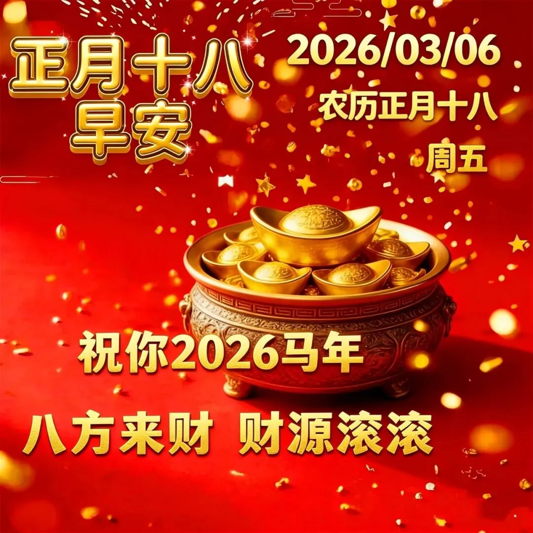 今天是正月十八,事事如意、发发发,祝福大家:2026年一路发,家庭幸福美满,事业蒸蒸日上,身体健康,吉祥如意!
