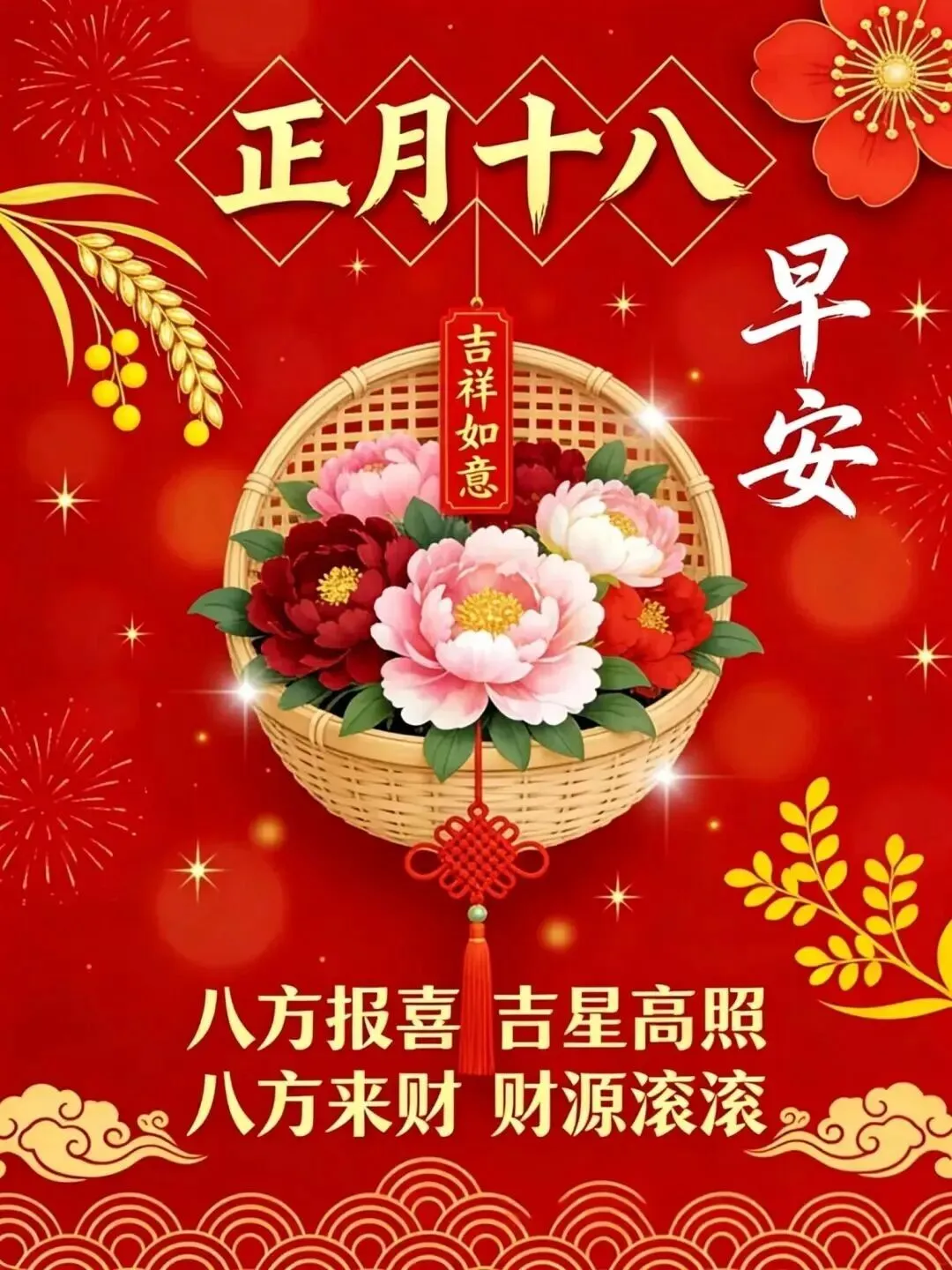 正月十八,寓意着“发”,前路坦途,事业发,紫气东来,财运发,花好月圆,桃花发,洪福齐天,好运发,愿你财源滚滚,福纳八方!