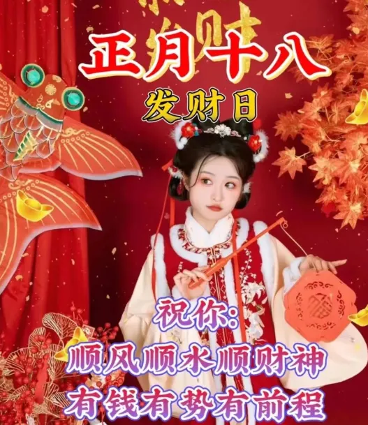 正月十八发财日,恭喜发财发发发,祝你在新的一年里,事业发,爱情发,财运发,早也发,晚也发,一定发,鸿运当头,发发发,大富大贵,发发发!