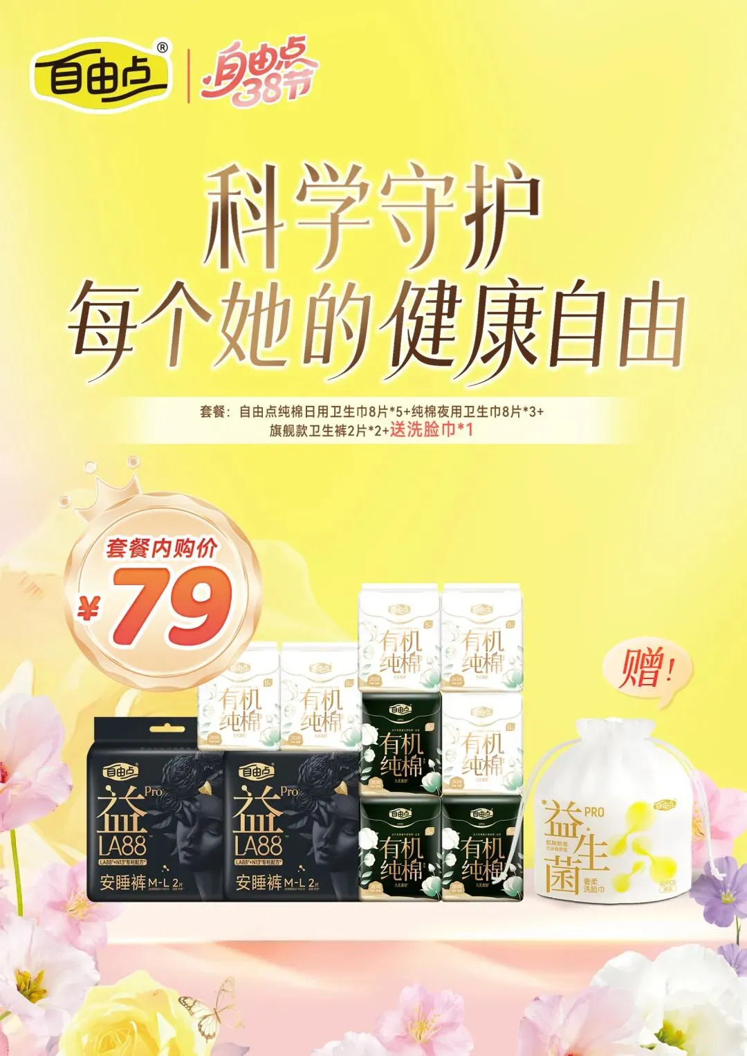 套餐:自由点纯棉日用卫生巾8片*5+纯棉夜用卫生巾8片*3+旗舰款卫生裤2片*2+送洗脸巾*1