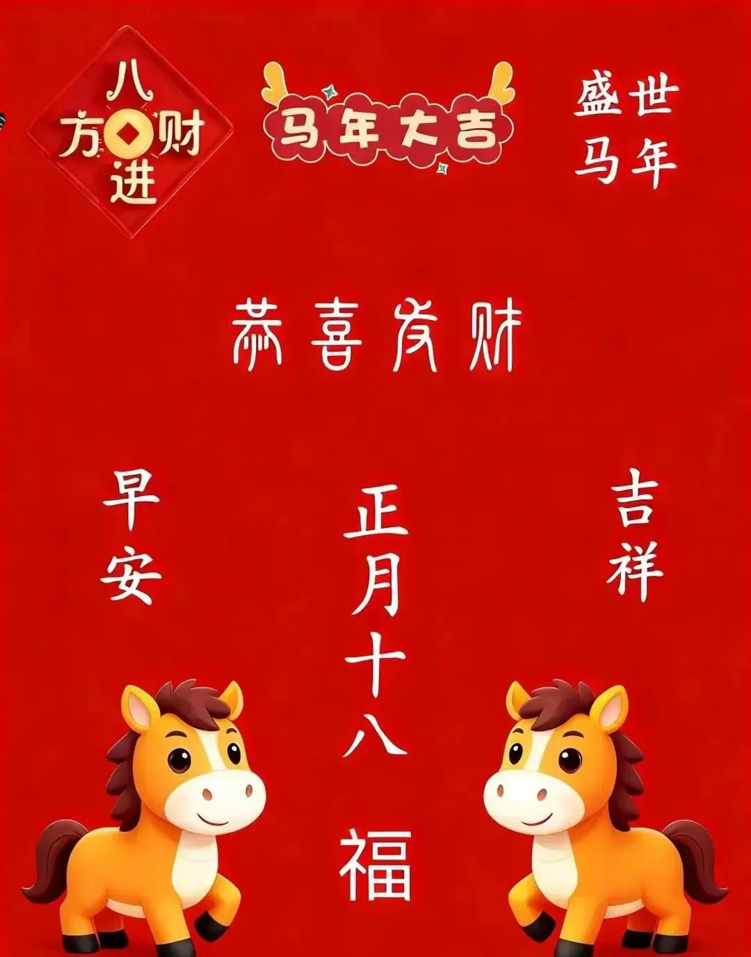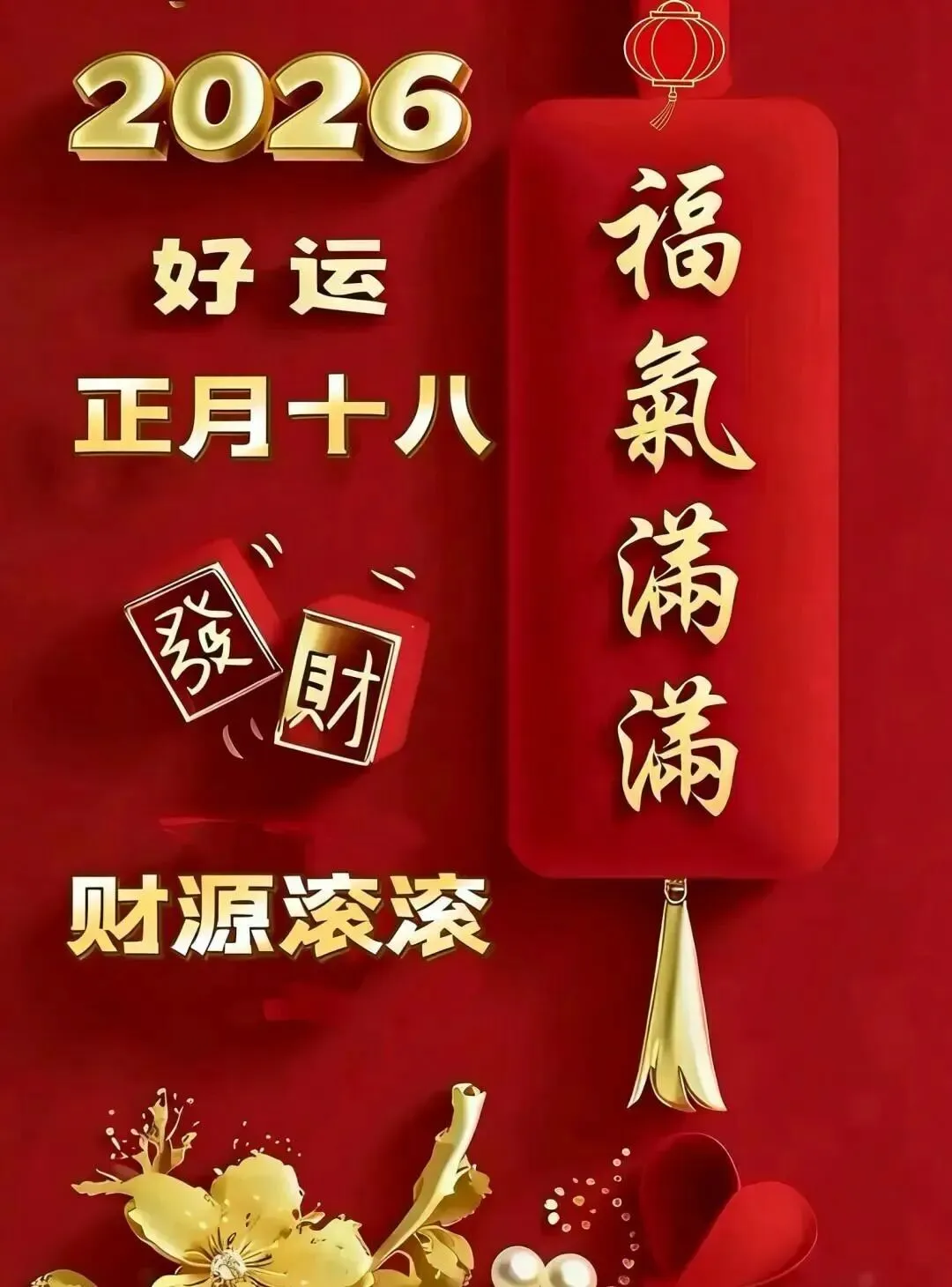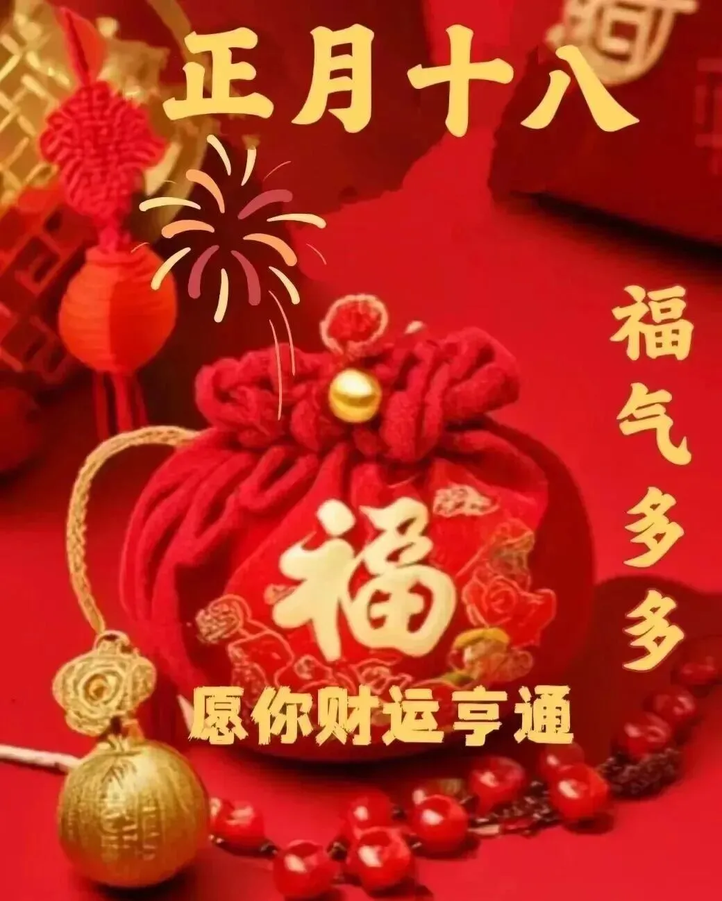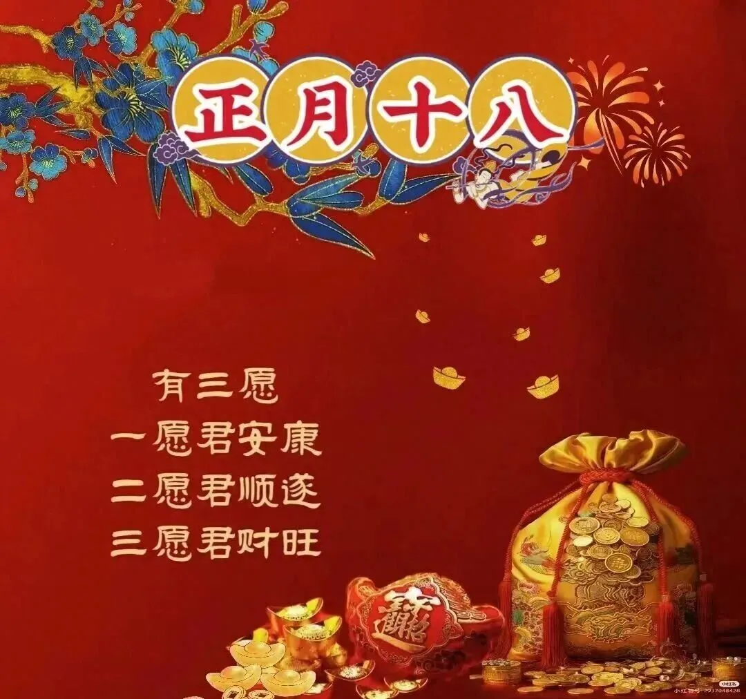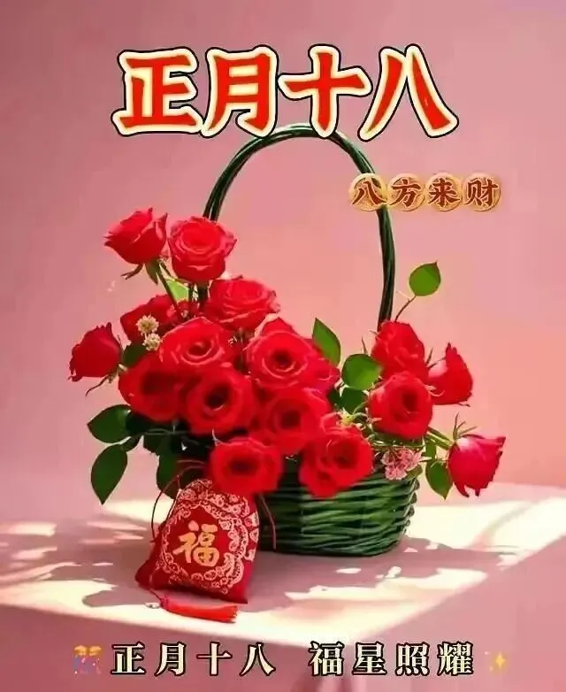8.正月十八发财日,祝你财顺,金银珠宝一筐筐,钱元银元无尽享,祝你财旺,吉祥如意日子旺!