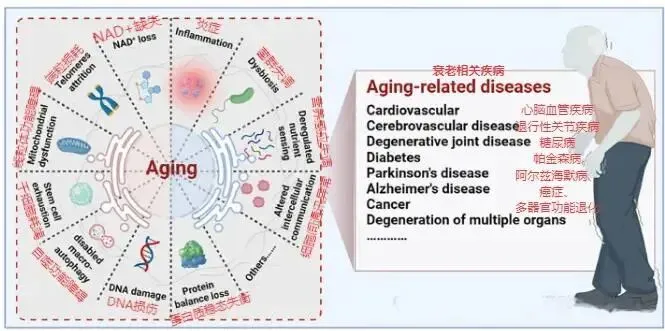 NAD+水平降低,影响了包括DNA修复、基因表达和代谢稳态在内的多种细胞功能,损害细胞能量代谢,从而推动衰老进程,进而引发生理衰退和疾病。