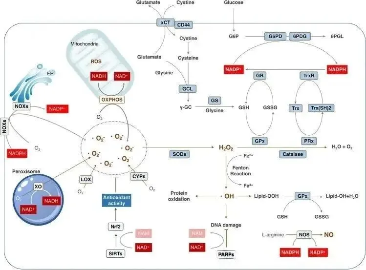 NAD+通过维持氧化还原稳态,如调节细胞内氧化剂ROS和抗氧化剂NADPH的平衡,保护细胞免受氧化应激损伤,减少氧化应激诱导的DNA损伤