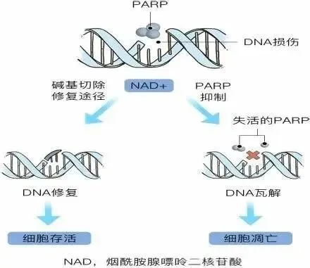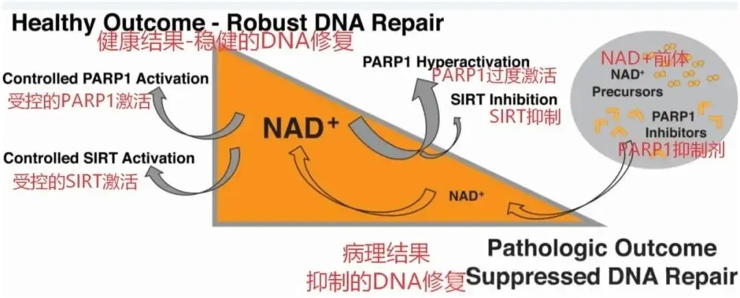 NAD+是DNA修复酶(PARPs)的必需底物,适度的NAD+水平可促进细胞生存,而过度消耗则可能影响其他NAD+的生理过程 。