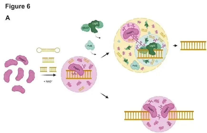 DNA受损时,PARP1作为信号通过PARylation协同修复因子共同完成DNA的修复。