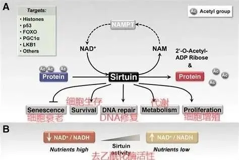 Sirtuins是高度依赖NAD+的组蛋白去乙酰化酶。Sirtuins也被称之为“长寿蛋白”。NAD+通过激活Sirtuins: