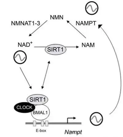 ·昼夜节律:研究表明,NAD+水平与生物钟基因(如CLOCK、BMAL1)同步波动,相互作用即“NAD+—SIRT1—CLOCK:BMAL1—NAMPT—NAD+”回路,调节代谢周期,帮助维持正常的昼夜节律和睡眠模式。