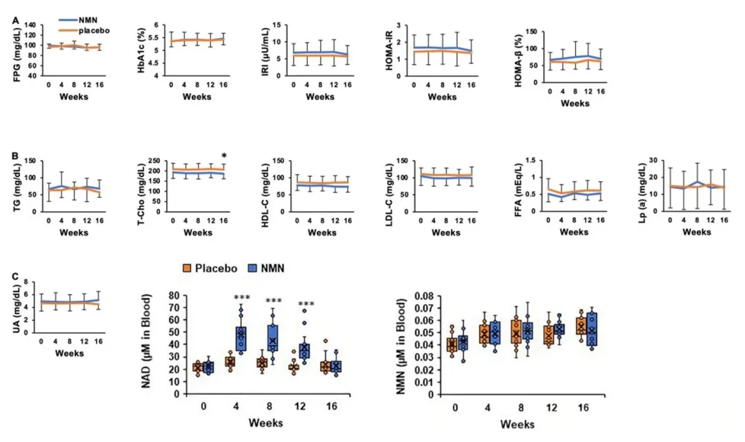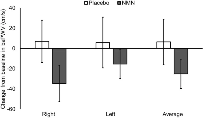 ·改善血管功能,降低心血管风险:NAD+促进血管内皮细胞增殖和减少动脉硬化,改善血液循环,降低心血管疾病的风险【8】。实验中NMN组BaPWV降低幅度约-20 cm/s,说明提高NAD+水平有助于动脉僵硬度减轻,动脉弹性改善