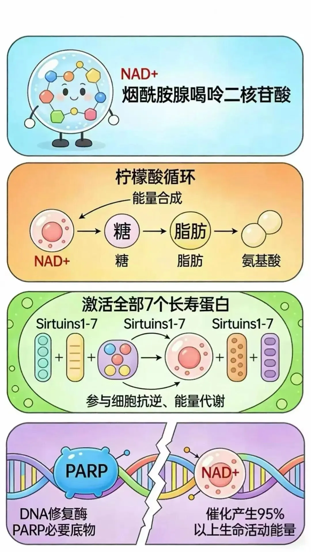 NAD+通过能量代谢生成ATP,调控并影响SIRTs、PARP家族等酶的活性,参与细胞信号传导、表观遗传调控和细胞周期的调控,从而(NAD+消耗酶)促进与DNA损伤修复。