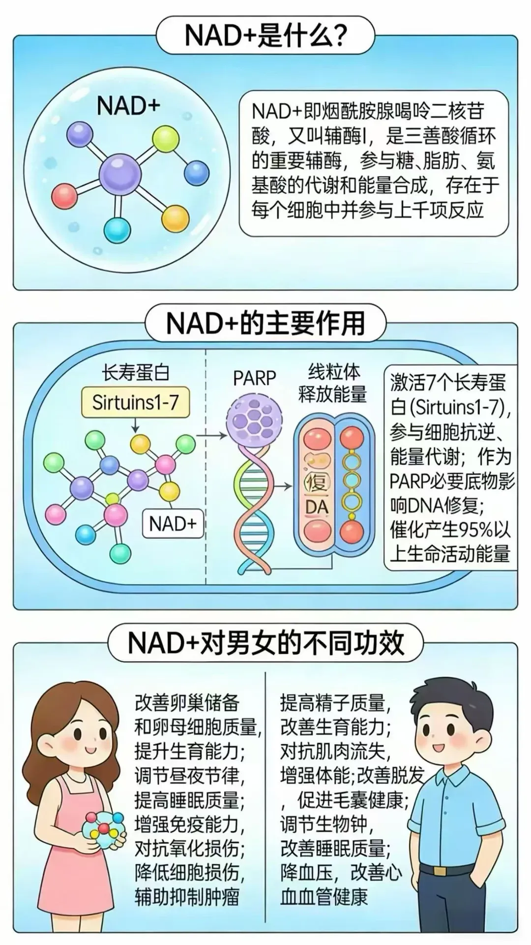 2、NAD+通过调控PARP、SIRT蛋白等分子,协调DNA修复与细胞代谢的平衡。
