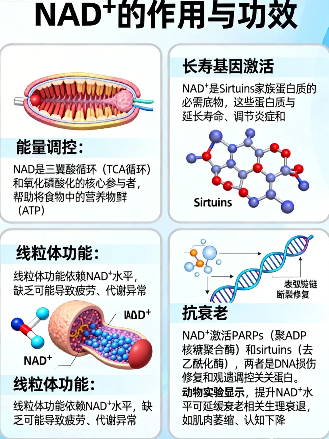 NAD+是DNA修复的关键分子,通过激活PARP1、SIRTs等酶参与DNA损伤修复途径和维持基因组稳定性。
