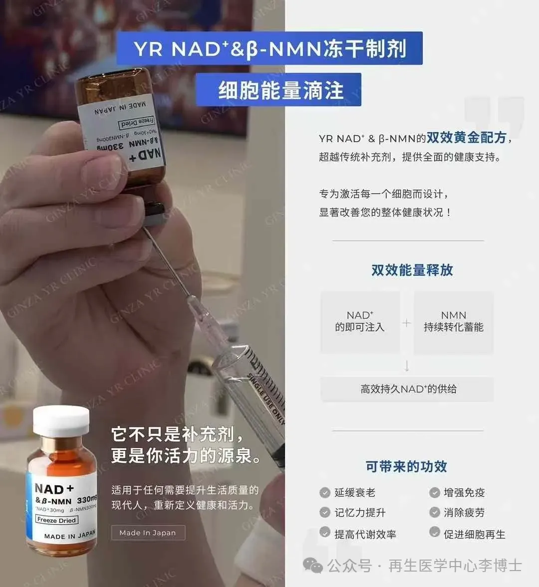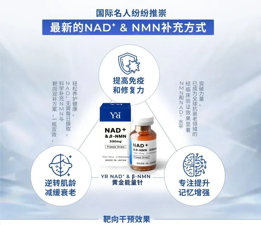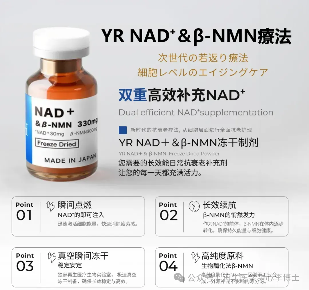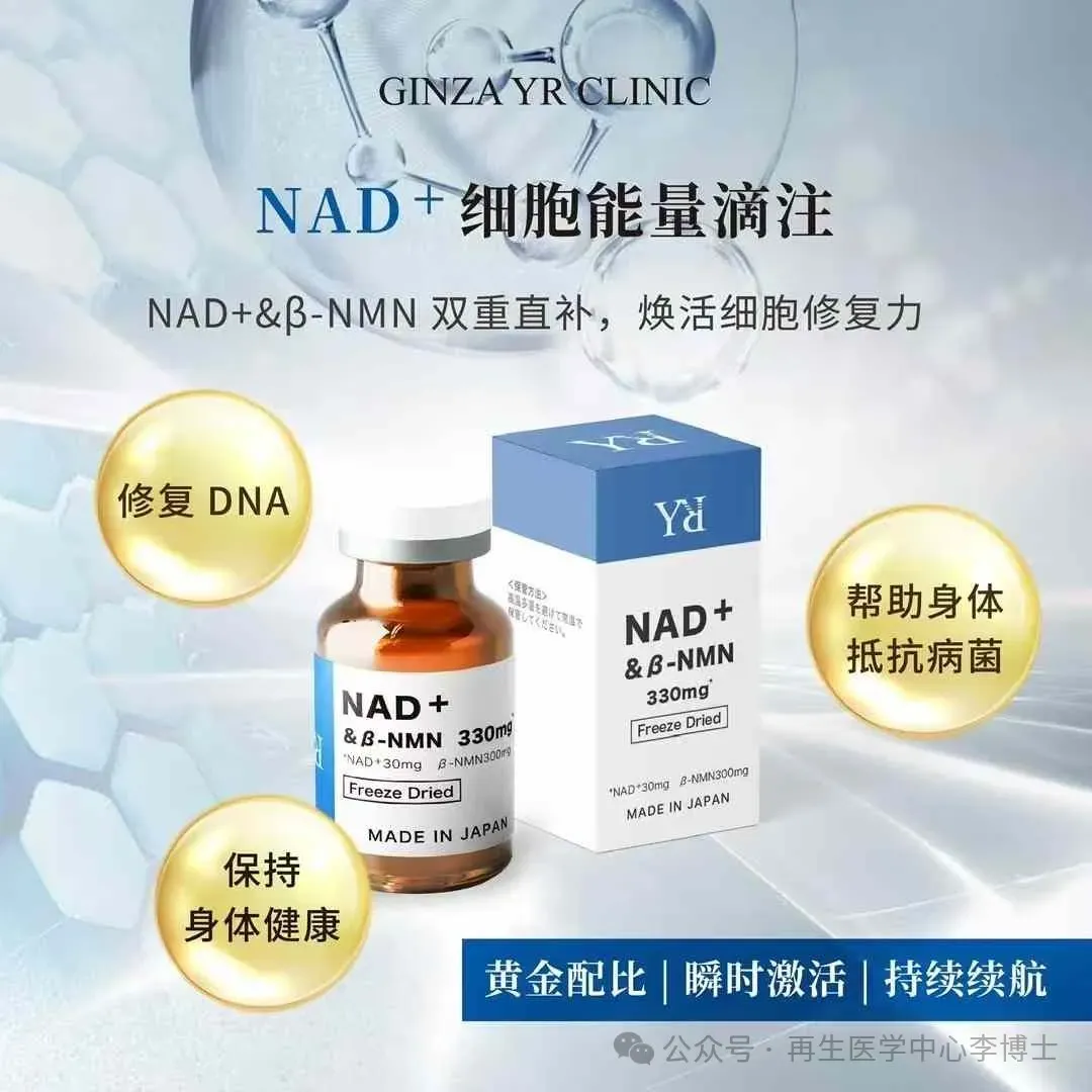 💙日本銀座YR Clinic顶级推荐 NAD+&βNMN330mg黄金比例细胞抗衰能量针。纯生物制剂,不含化工合成NMN 日清原料荣誉出品。双重平衡补充完美配比,吸收转化率极高,即时感受与持续延缓衰老效果更好。