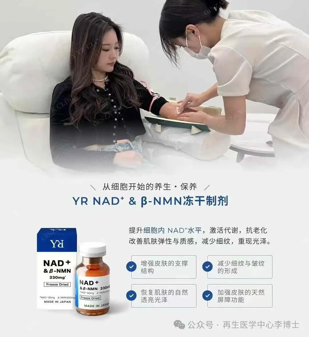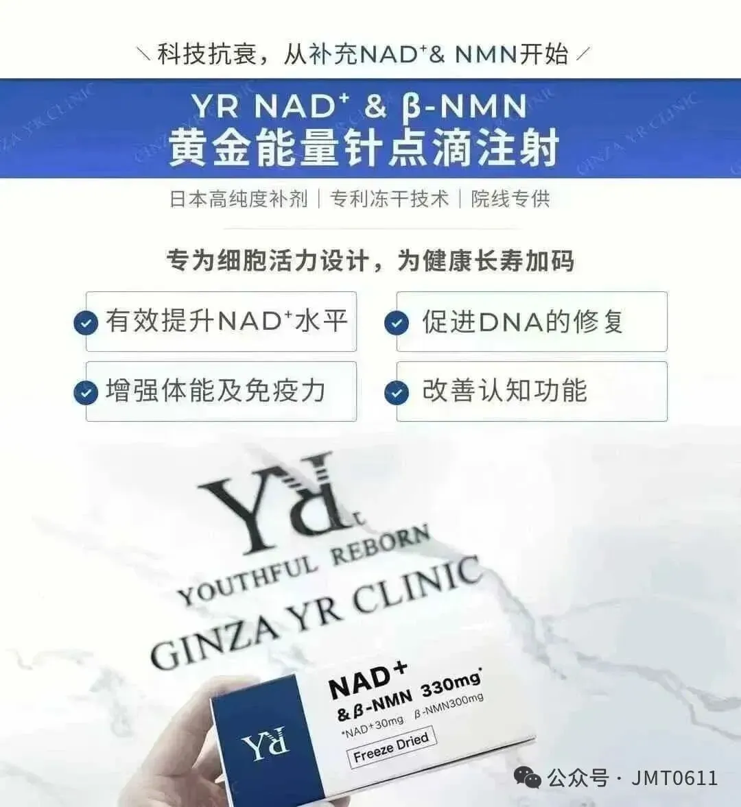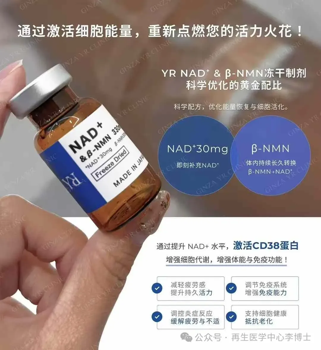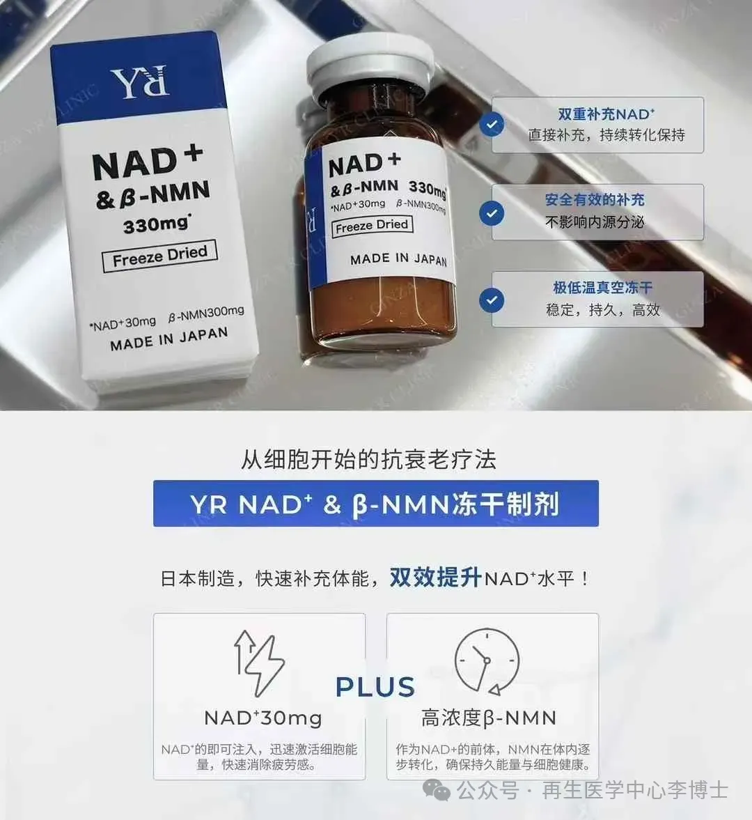 💙日本銀座YR Clinic顶级推荐 NAD+&βNMN330mg黄金比例细胞抗衰能量针。纯生物制剂,不含化工合成NMN 日清原料荣誉出品。双重平衡补充完美配比,吸收转化率极高,即时感受与持续延缓衰老效果更好。